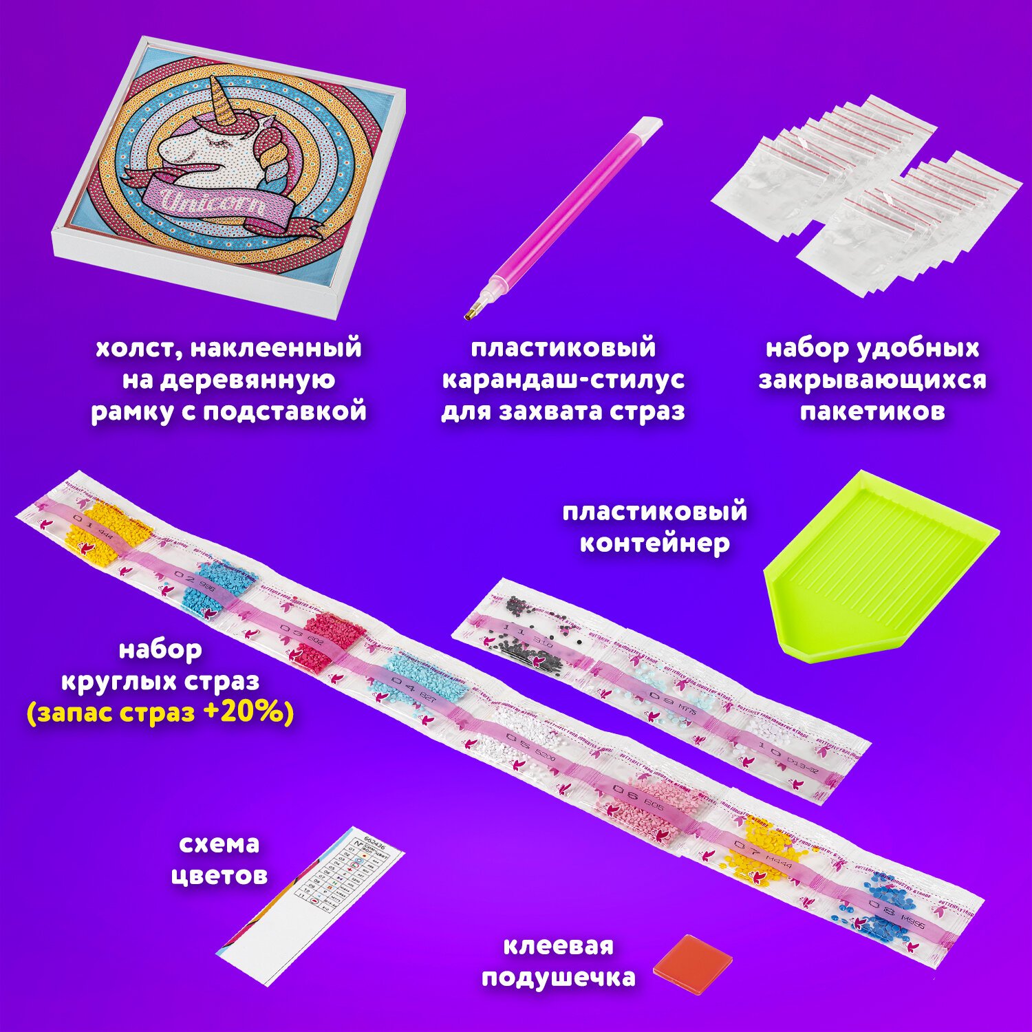 Набор для создания картины стразами "Единорог" включает в себя:
