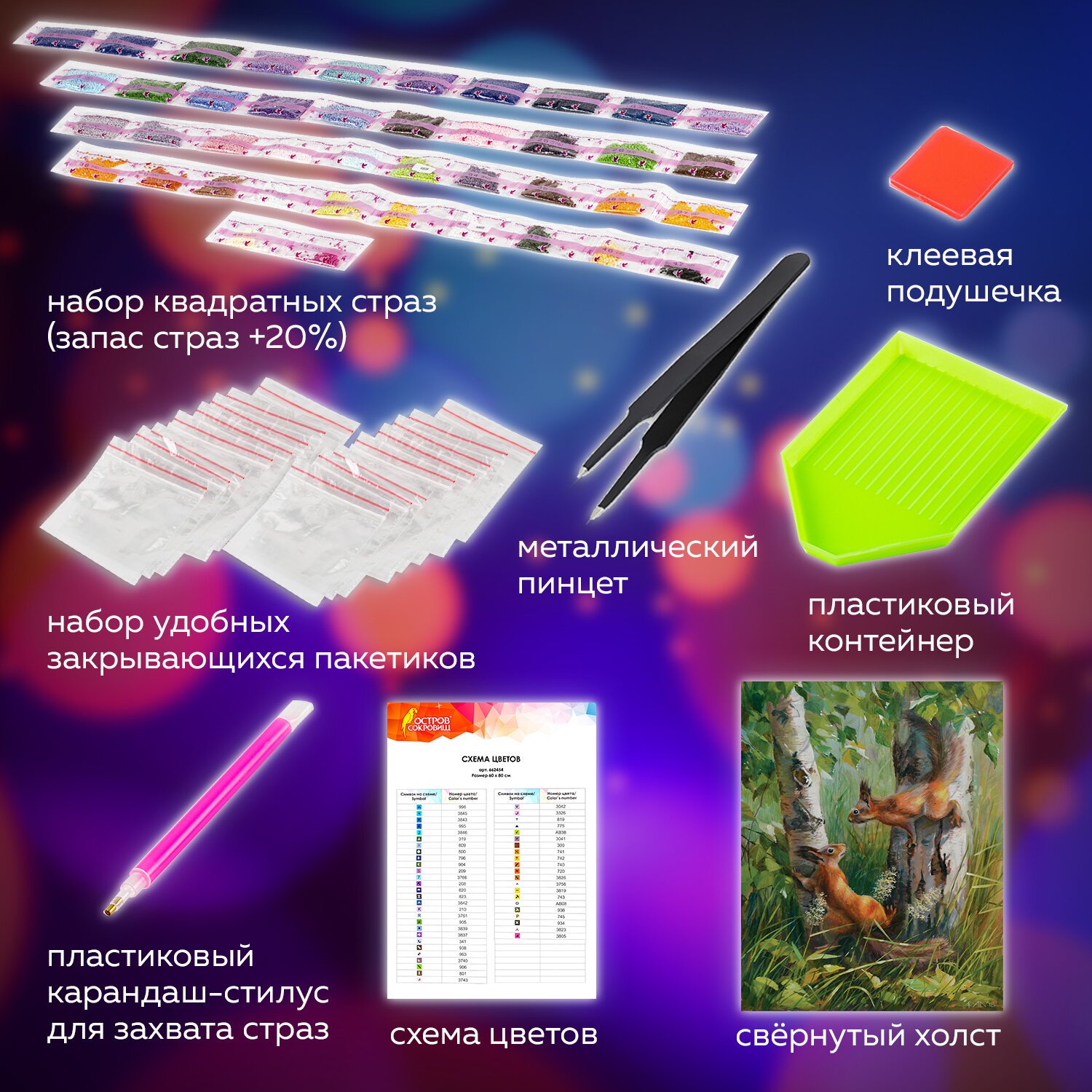 Картина стразами "Белочки" основывается на эксклюзивном сюжете "Наперегонки?" от российского художника Неприятель Ю. А. и включает в себя: