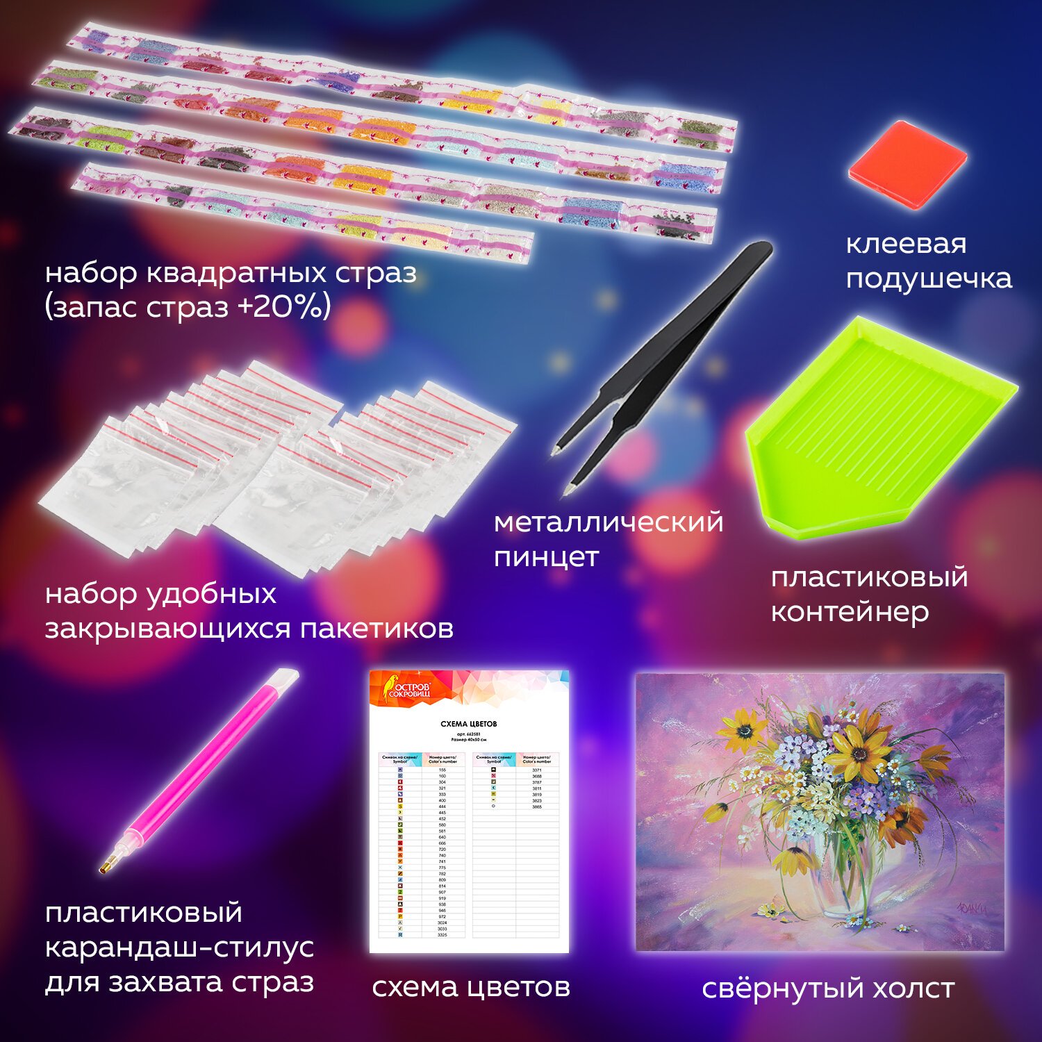 Картины стразами ОСТРОВ СОКРОВИЩ - это наборы для создания картин в технике алмазной мозаики. Холст с нанесенным изображением и клеевым слоем заполняется акриловыми стразами. В наборе содержится всё необходимое для создания шедевра своими руками.