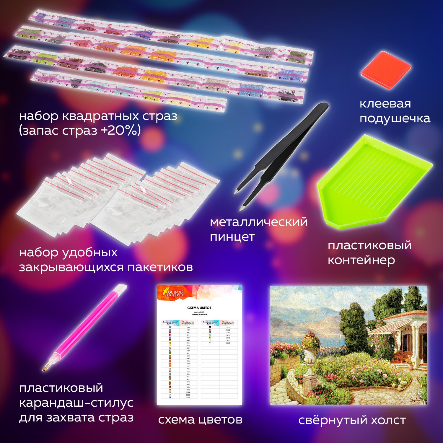 Картины стразами ОСТРОВ СОКРОВИЩ - это наборы для создания картин в технике алмазной мозаики. Холст с нанесенным изображением и клеевым слоем заполняется акриловыми стразами. В наборе содержится всё необходимое для создания шедевра своими руками.