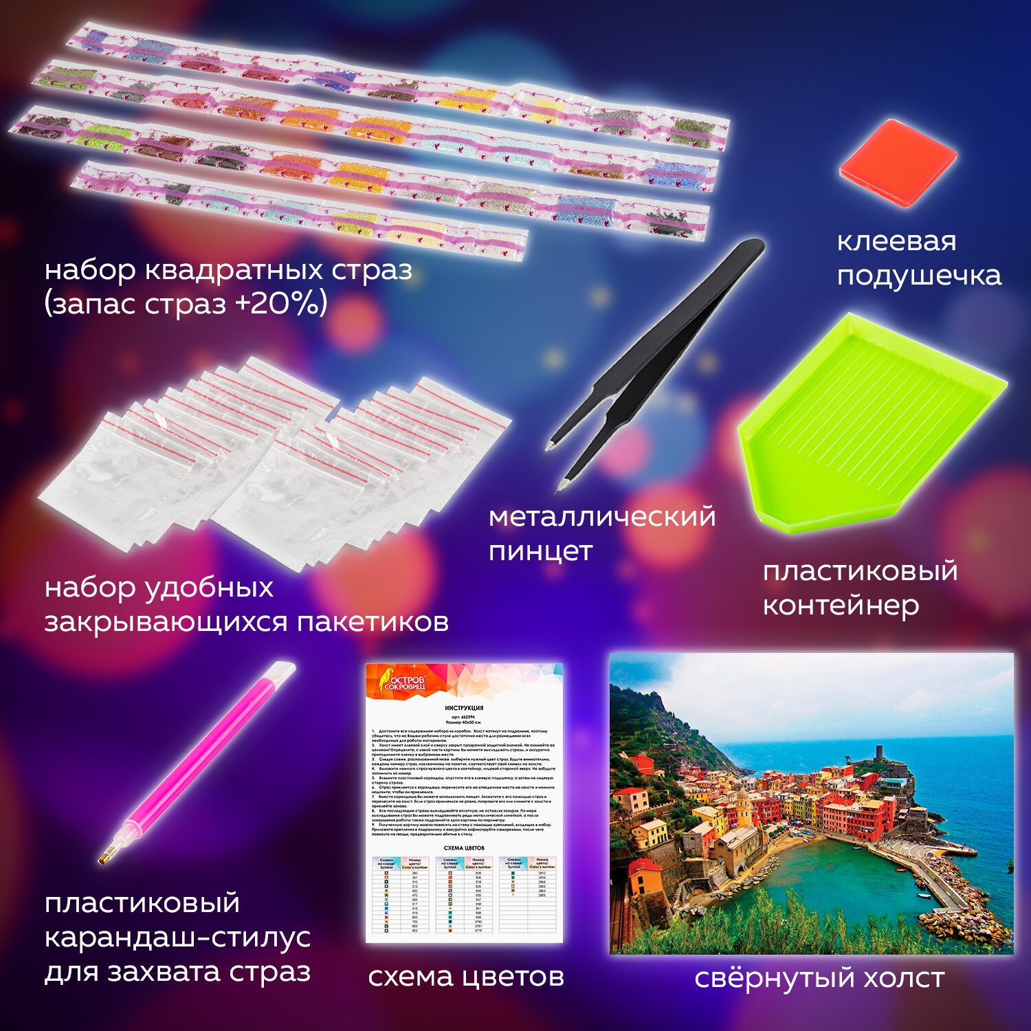 Картина стразами "Прибрежный городок" включает в себя: