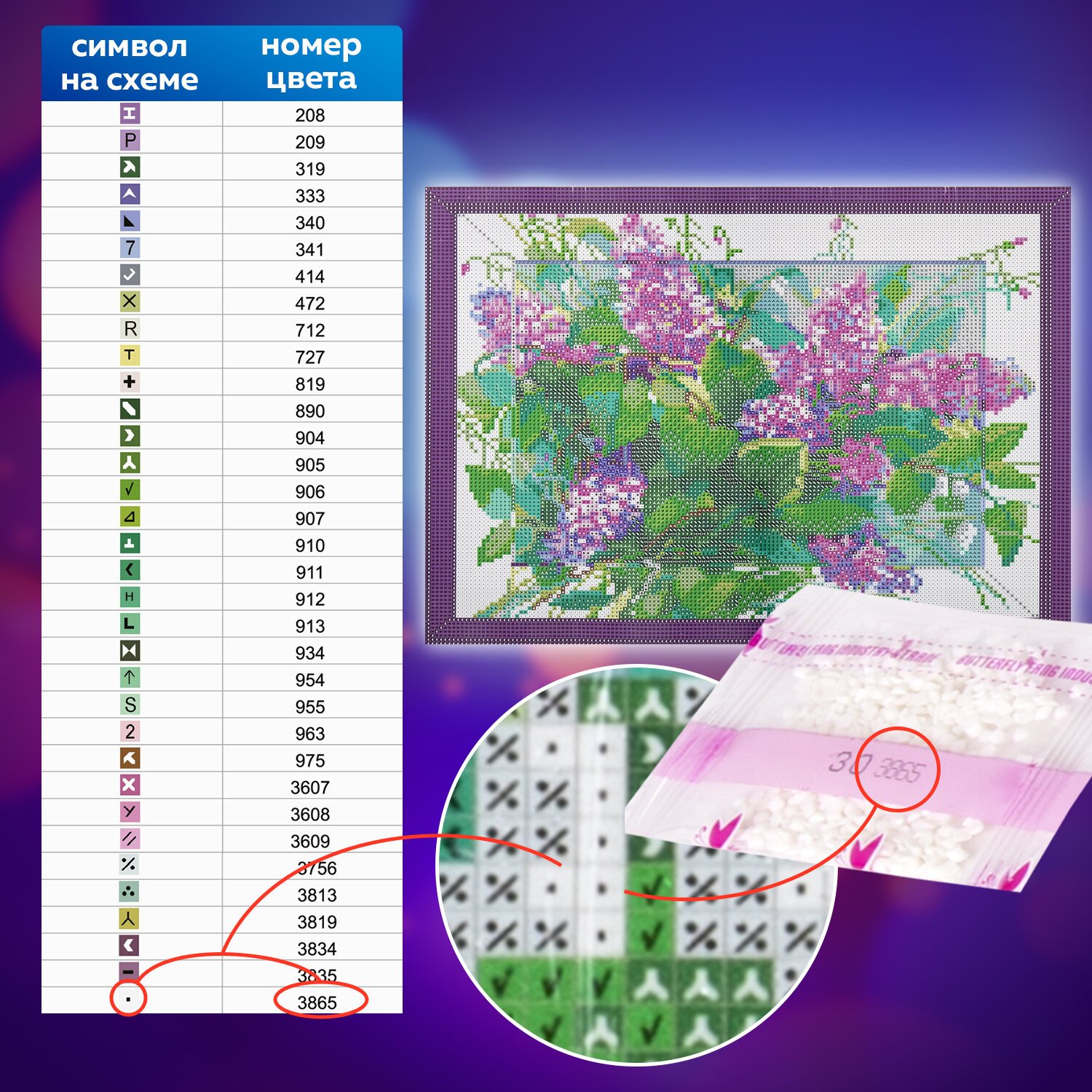 Картина стразами "Сирень" представляет собой эксклюзивный сюжет по картине российского художника Калашниковой Е. В. и включает в себя: