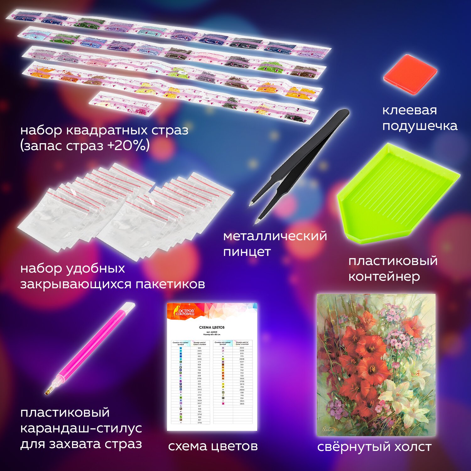 Картина стразами "Цветочная симфония августа" представляет собой эксклюзивный сюжет по картине российского художника Калашниковой Е. В. и включает в себя: