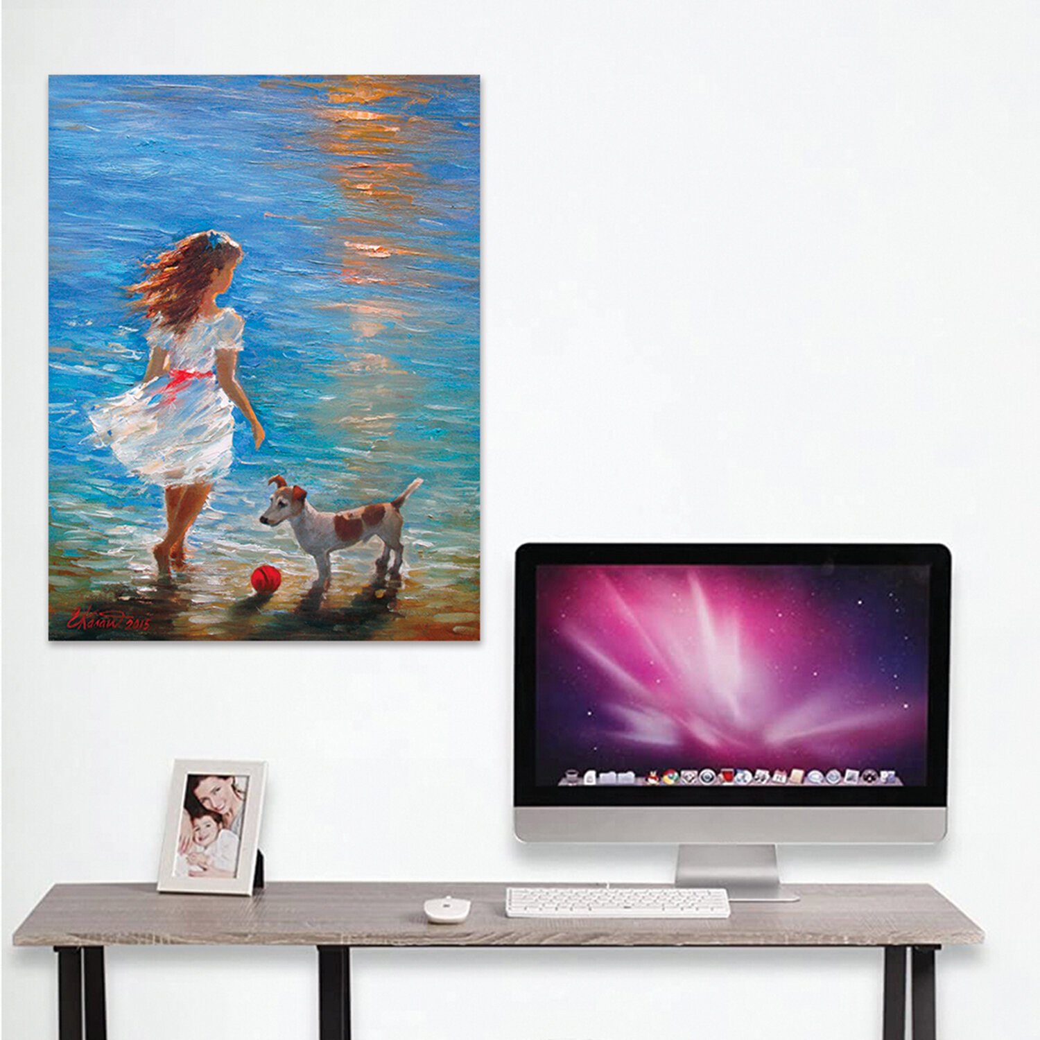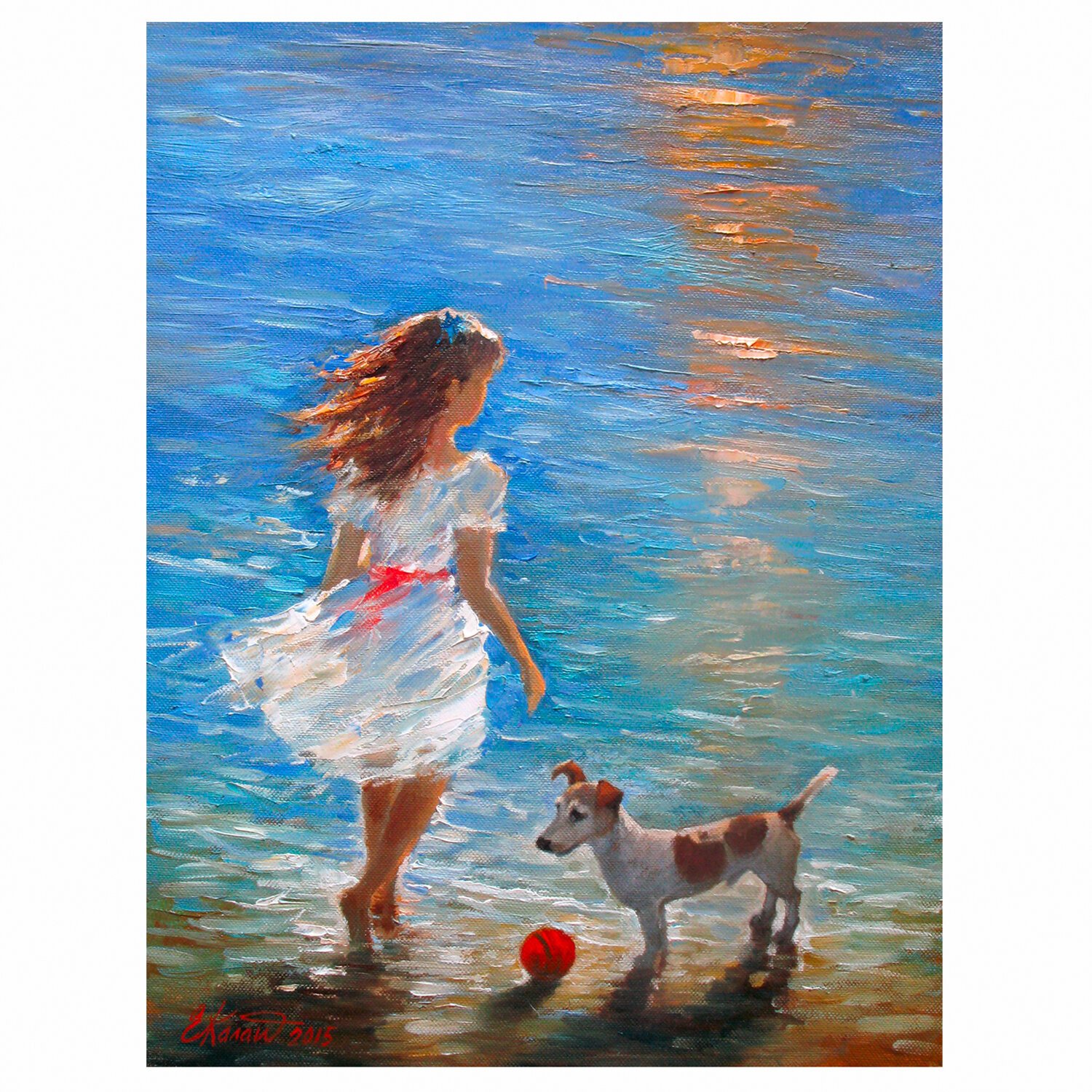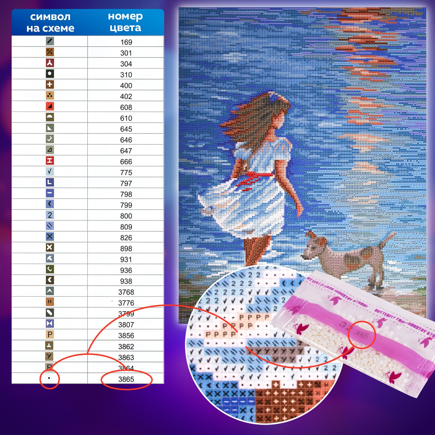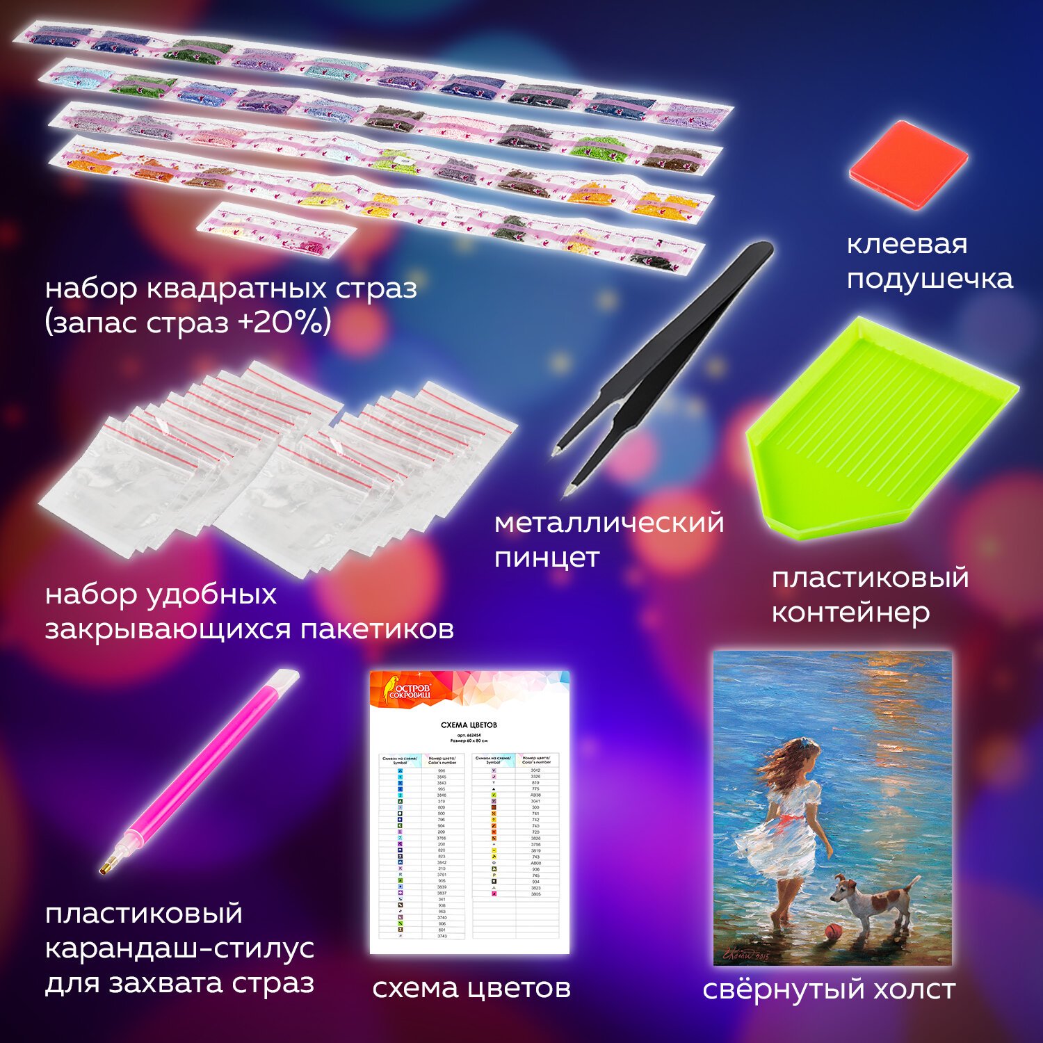 Картина стразами "Девочка с собачкой" основывается на эксклюзивном сюжете "Настя и Гоша на прогулке" от российского художника Калашниковой Е. В. и включает в себя: