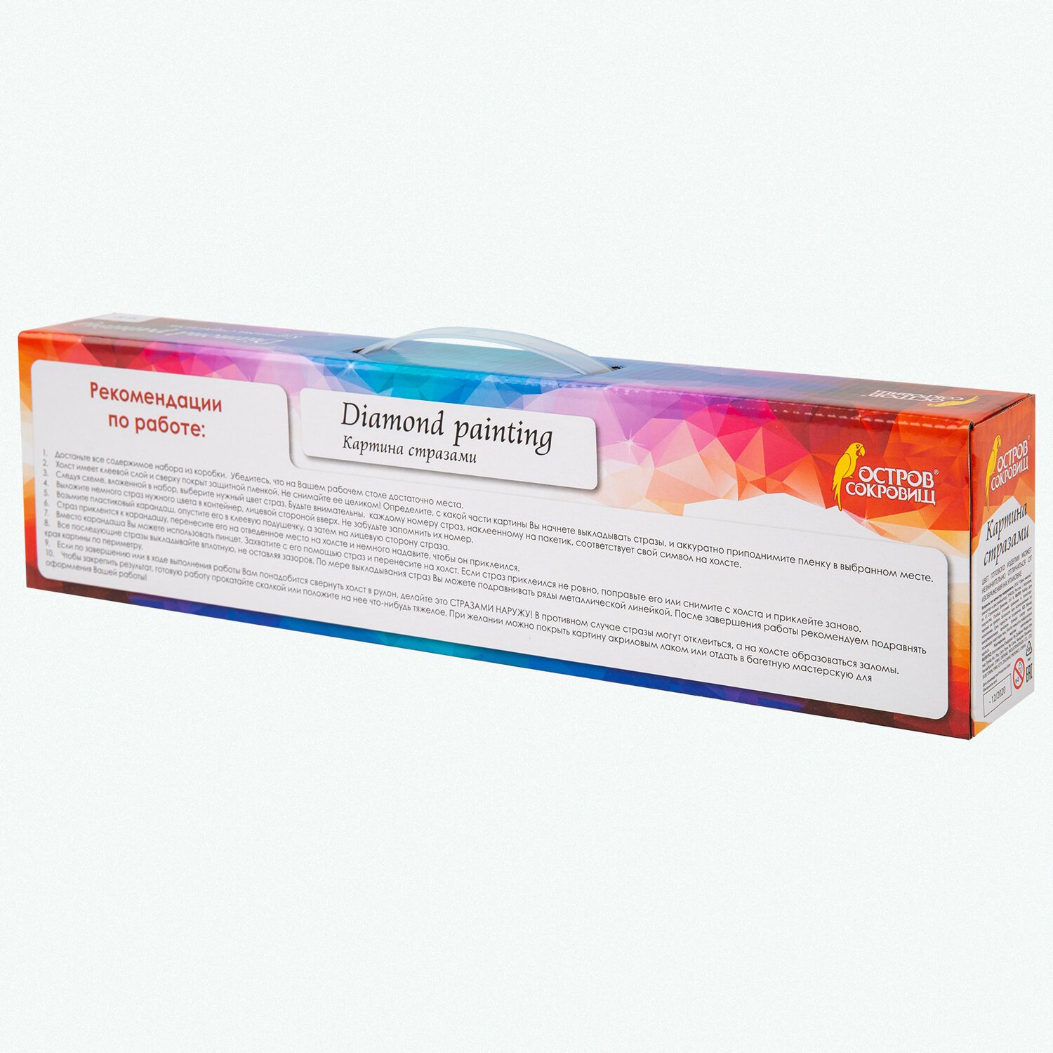 Размер готовой картины составляет 40х50 см. Картина полностью заполняется квадратными акриловыми стразами, благодаря чему готовая работа блистает и переливается на свету.
