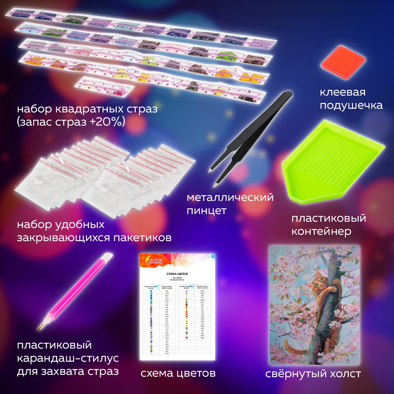 Картина стразами "Кот на дереве" основывается на эксклюзивном сюжете "Всё выше, и выше, и выше!" от российского художника Неприятель Ю. А. и включает в себя: