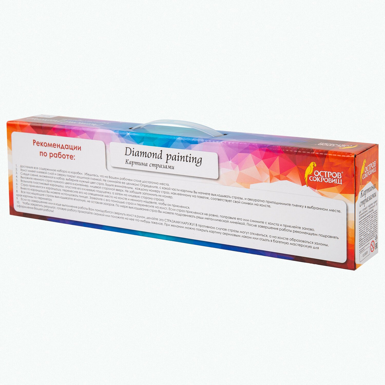 Размер готовой картины составляет 40х50 см. Картина полностью заполняется квадратными акриловыми стразами, благодаря чему готовая работа блистает и переливается на свету.