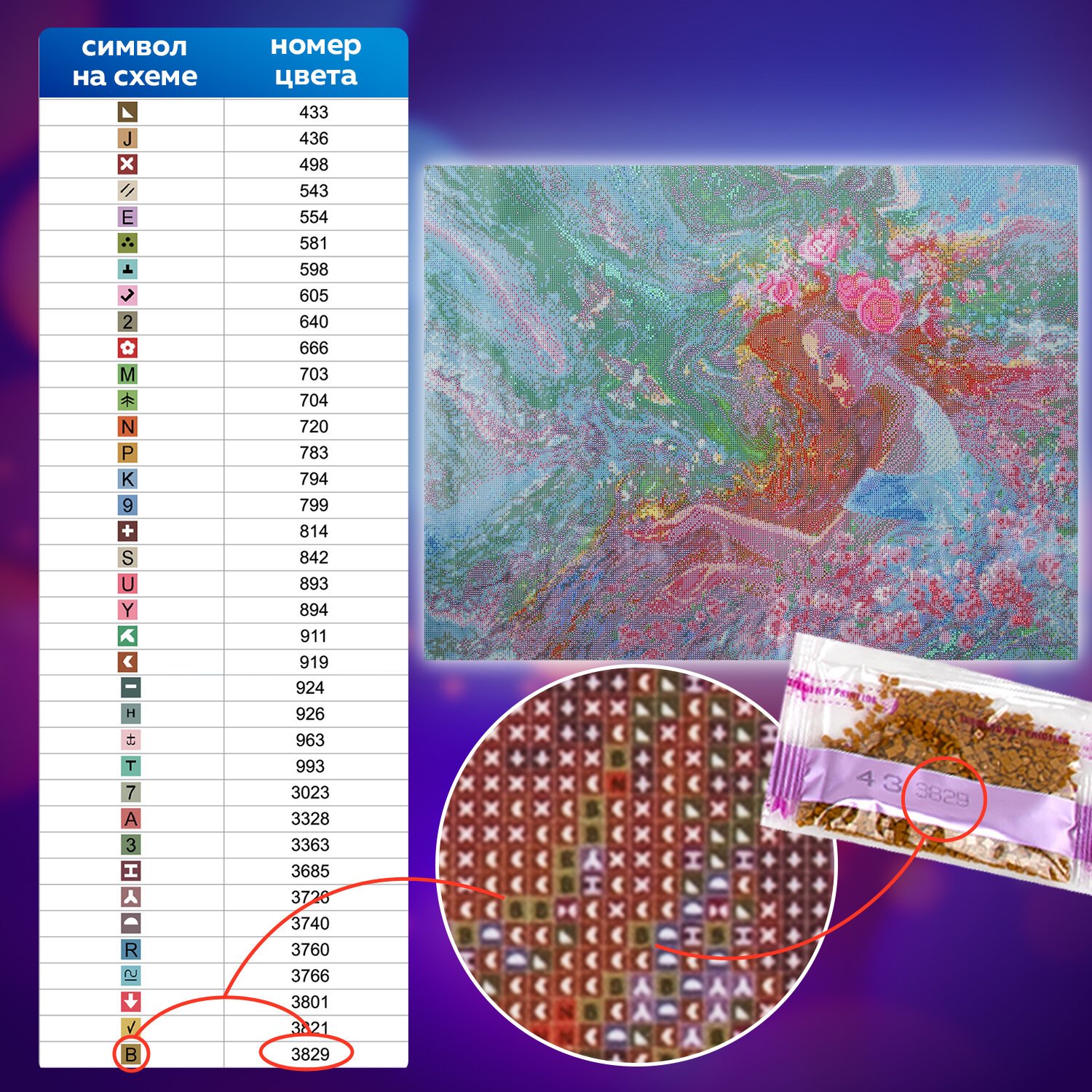 - схема соответствия цветов страз и символов на холсте.
