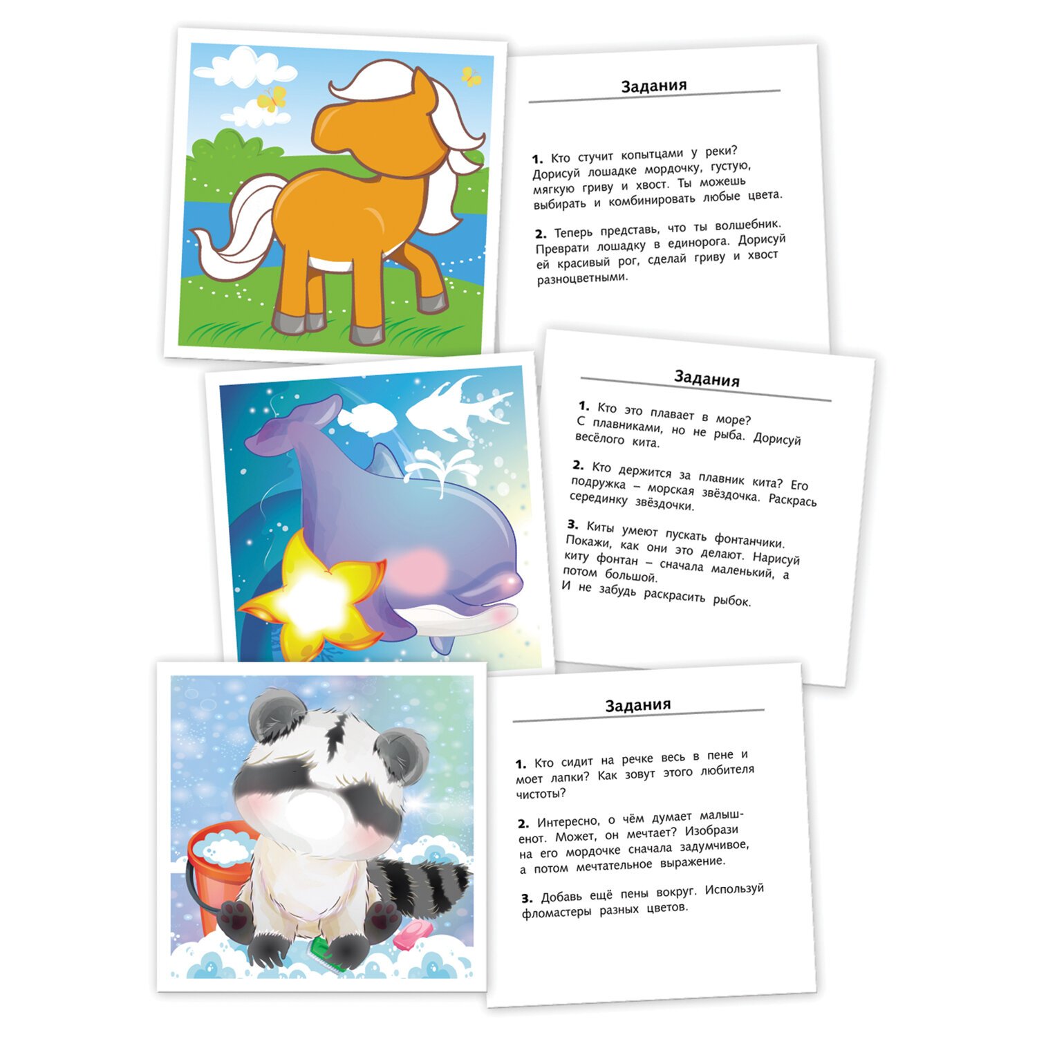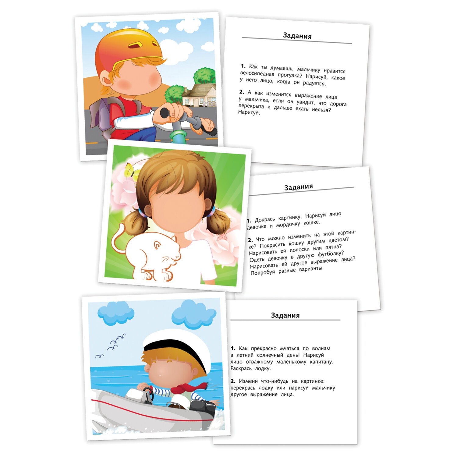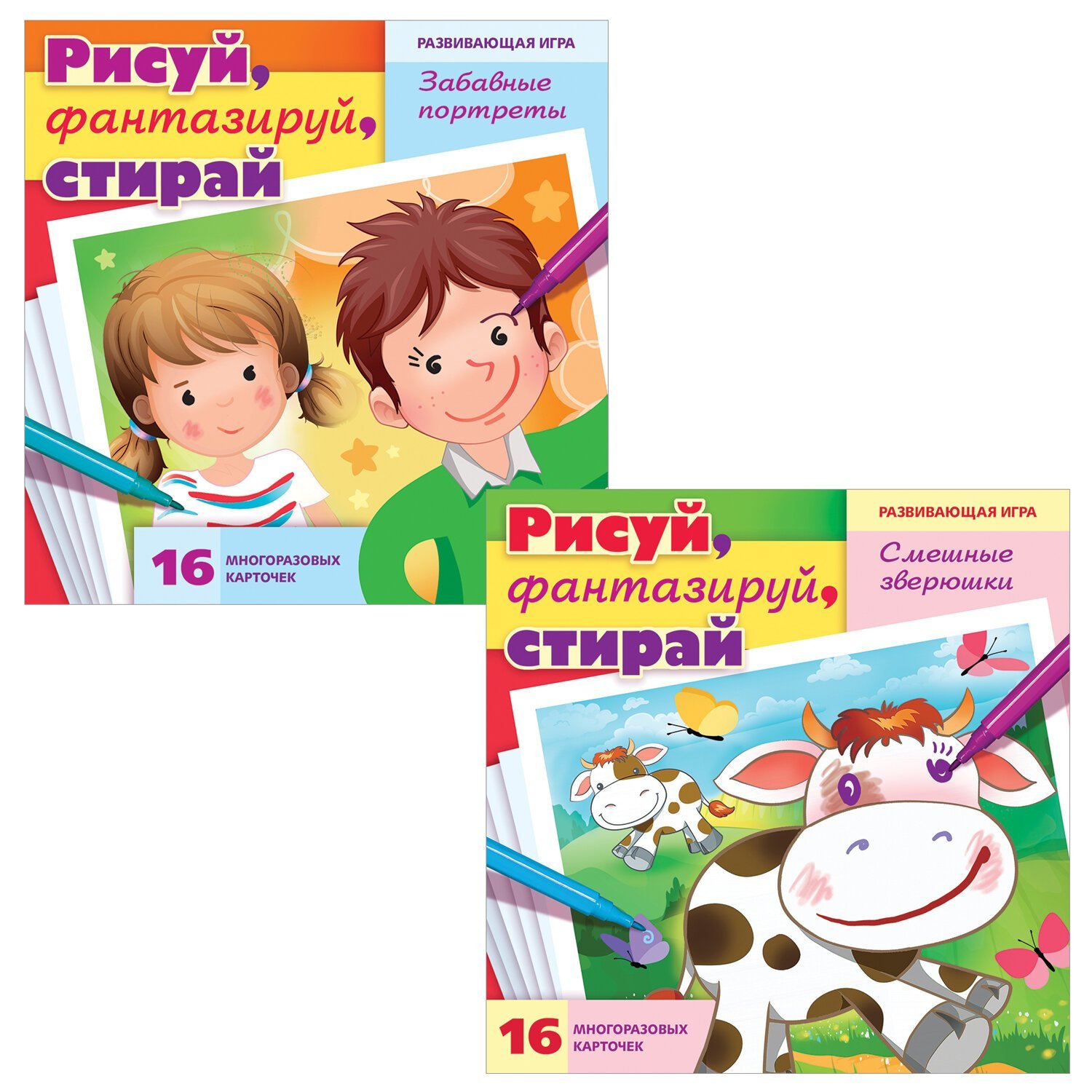 Карточки направлены на развитие фантазии, эмоционального интеллекта и мелкой моторики малыша. Комплект состоит из 16 многоразовых карточек, на которых можно рисовать любыми фломастерами, кроме перманентных. Нарисованное можно стереть влажной салфеткой или губкой. На лицевой стороне многоразовой карточки малыша ждет красочная картинка с изображением человека, на обратной стороне располагаются задания.