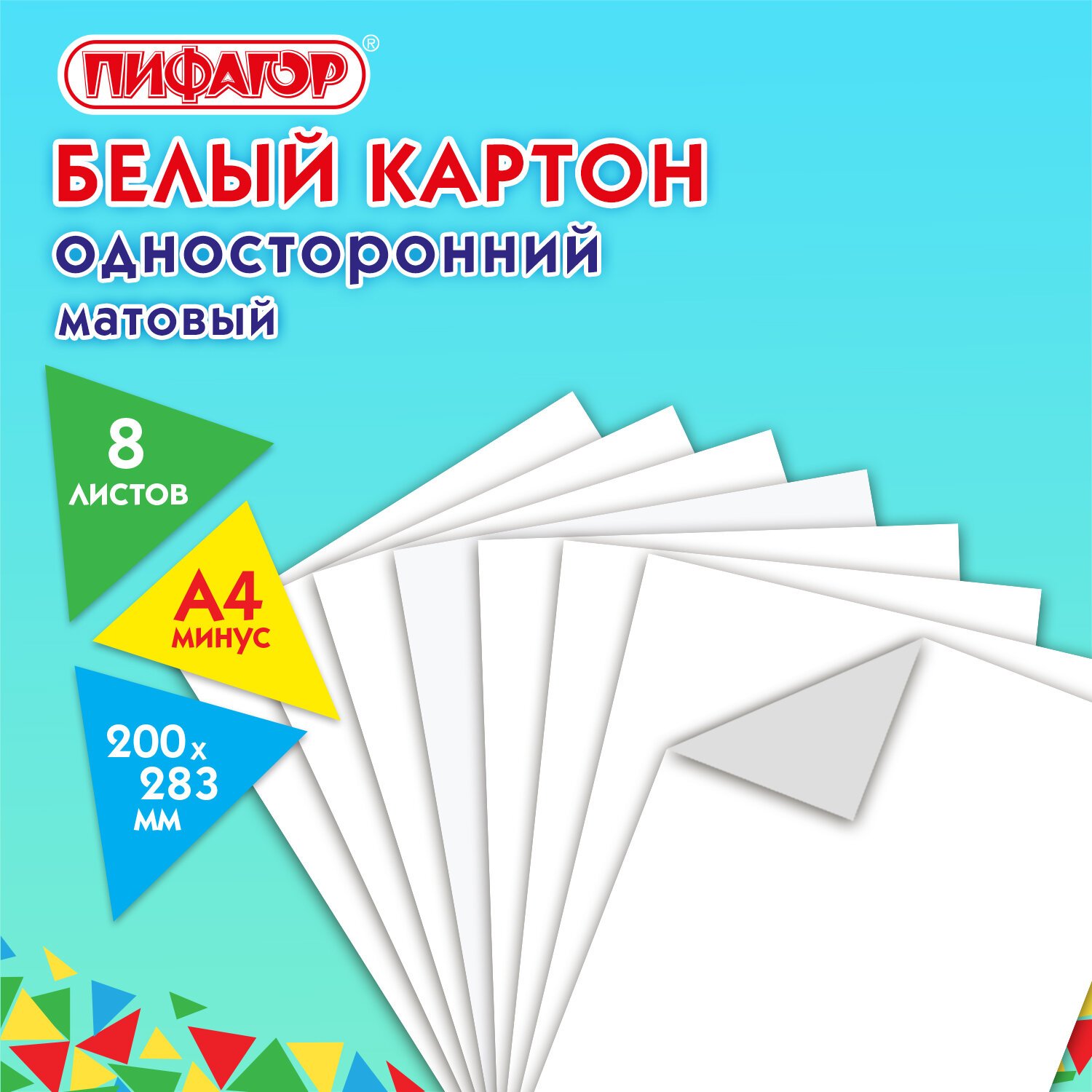 Картон белый А4 немелованный (матовый), 8 листов, ПИФАГОР, 200х283 мм, 127049