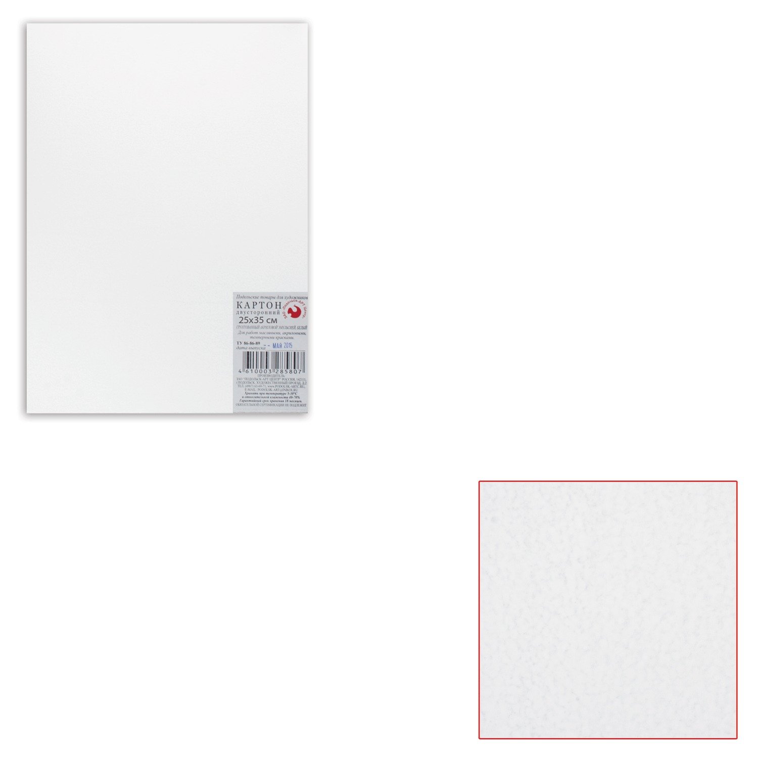 Двусторонний картон покрыт водоэмульсионным грунтом на акриловой основе с добавлением связующего клея. Картон имеет однородный цвет. Позволяет сохранить произведение в его первозданном виде на долгие годы.