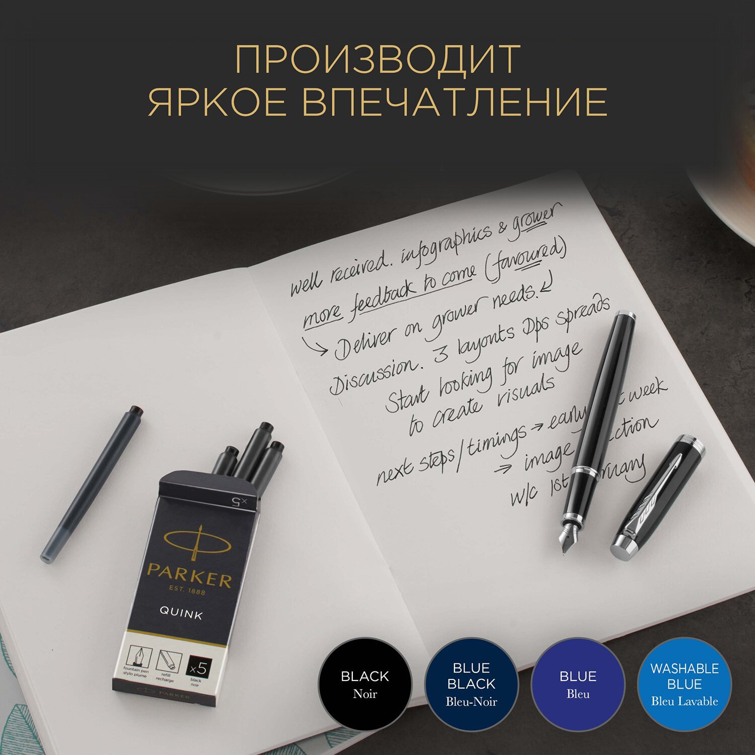Для удобства использования чернила поставляются в прозрачных картриджах. Подходят ко всем перьевым ручкам Parker.