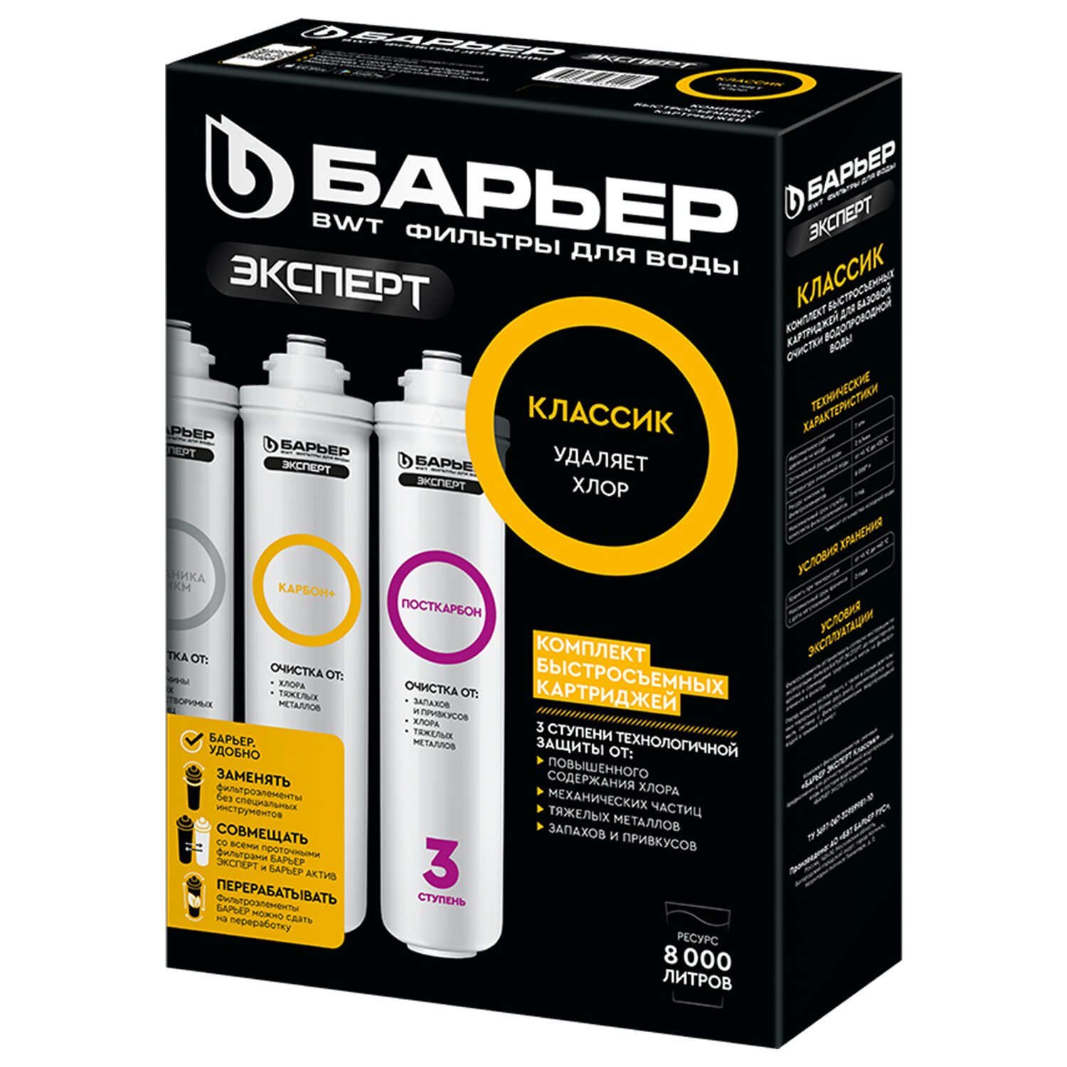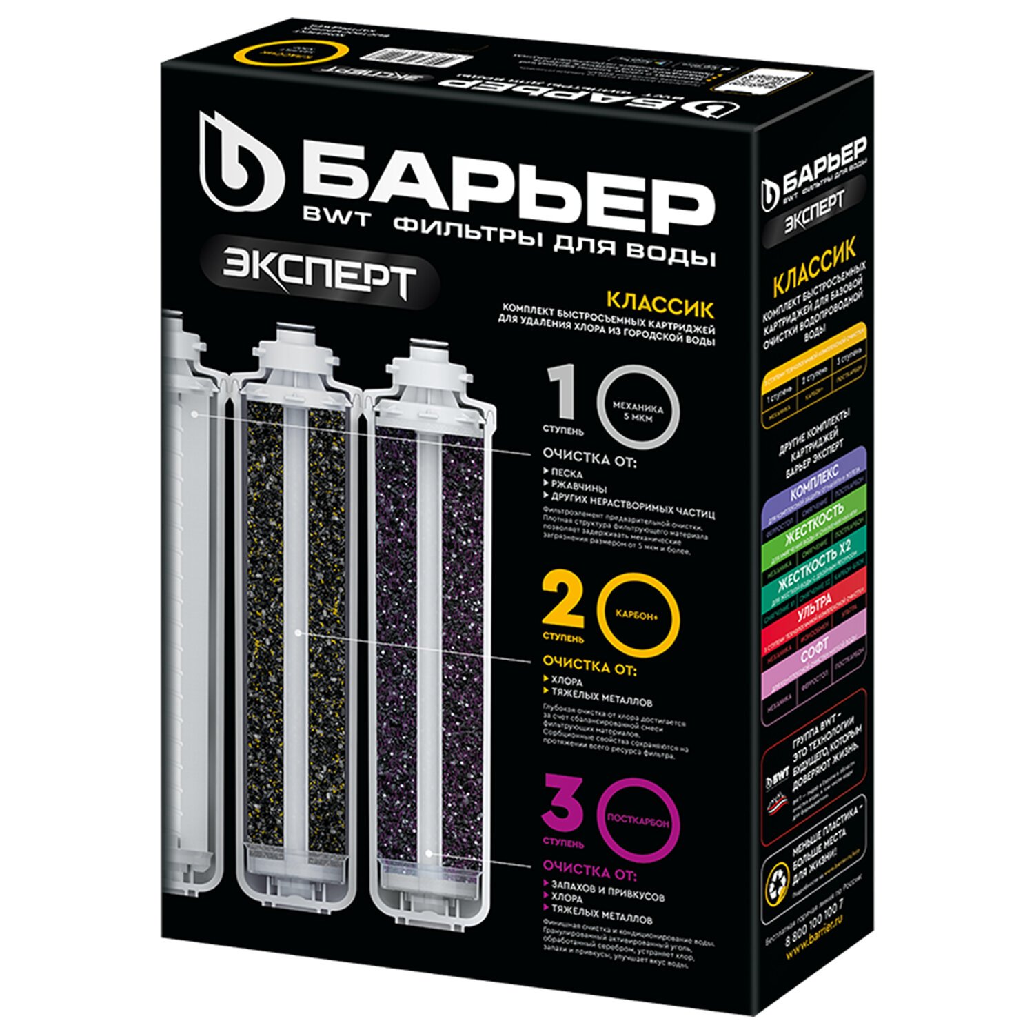 Комплект сменных картриджей «БАРЬЕР ЭКСПЕРТ Классик» — это простое, экономичное и эффективное решение для доочистки городской водопроводной воды, насыщенной хлором, его побочными продуктами и механическими загрязнениями.
