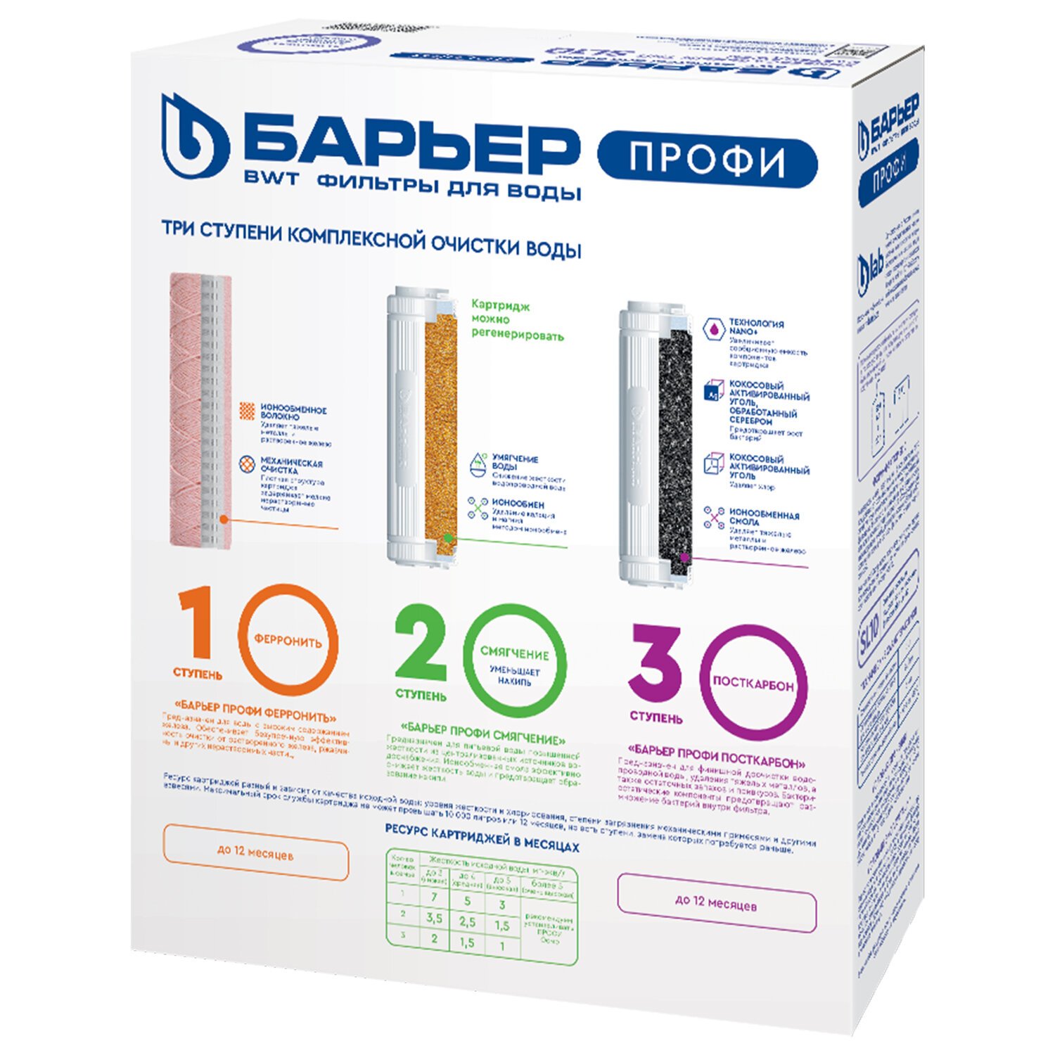 2 ступень — картридж Смягчение для фильтра БАРЬЕР ПРОФИ. Снижает карбонатную жесткость, из-за которой образуется накипь в чайнике. Ресурс до 6 месяцев, однако картридж может быть подвергнут регенерации в домашних условиях с помощью простой поваренной НЕ йодированной соли (не более 8 раз).