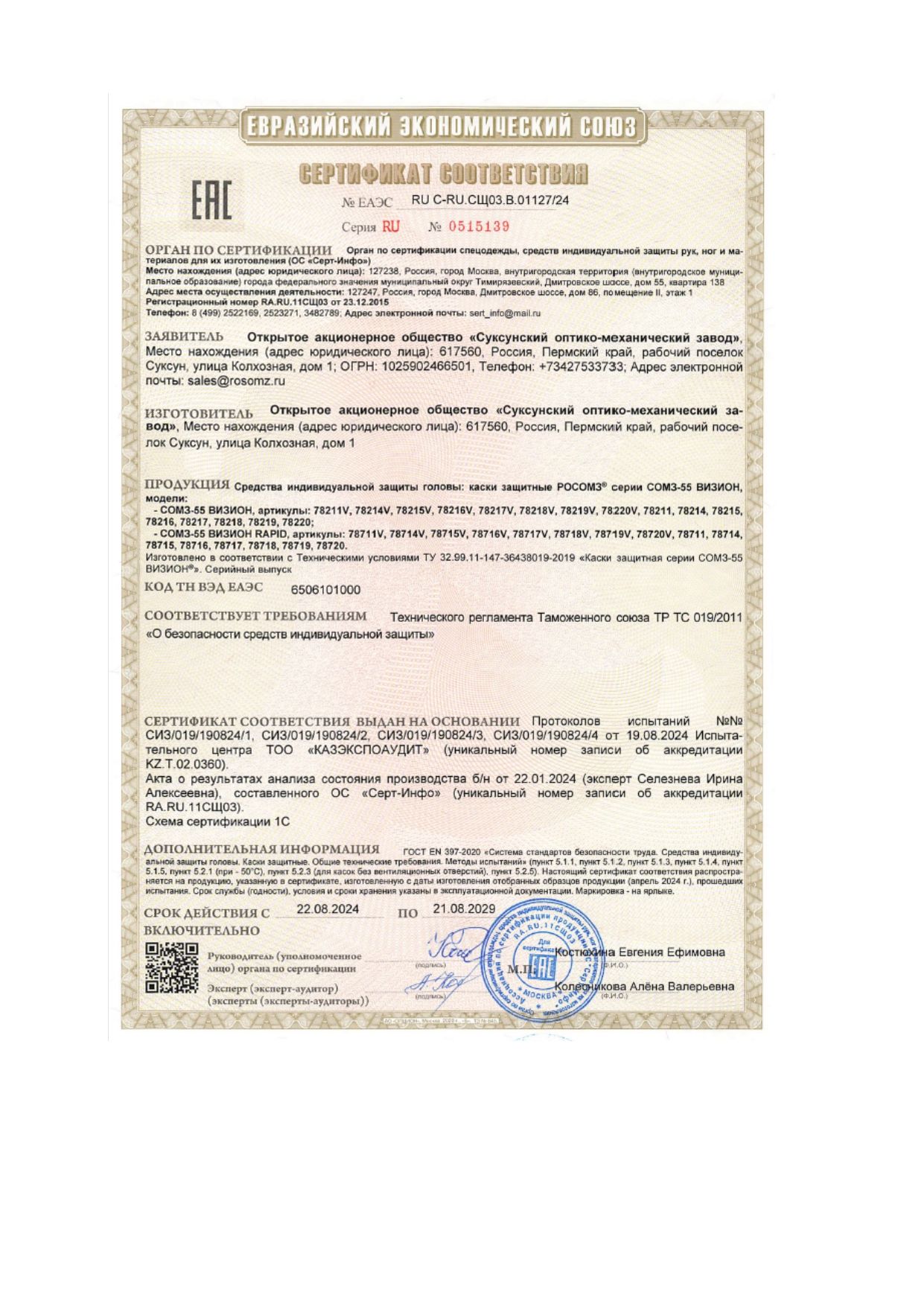 Корпус выполнен из материала Termotrek®. Внутренняя оснастка - ЭТАЛОН с тканными амортизационными лентами, несущая/затылочная лента со ступенчатой регулировкой Super Standart. Пазы в корпусе каски для совместного ношения с защитными лицевыми щитками с креплением на каске и наушниками противошумными с креплением на каске.