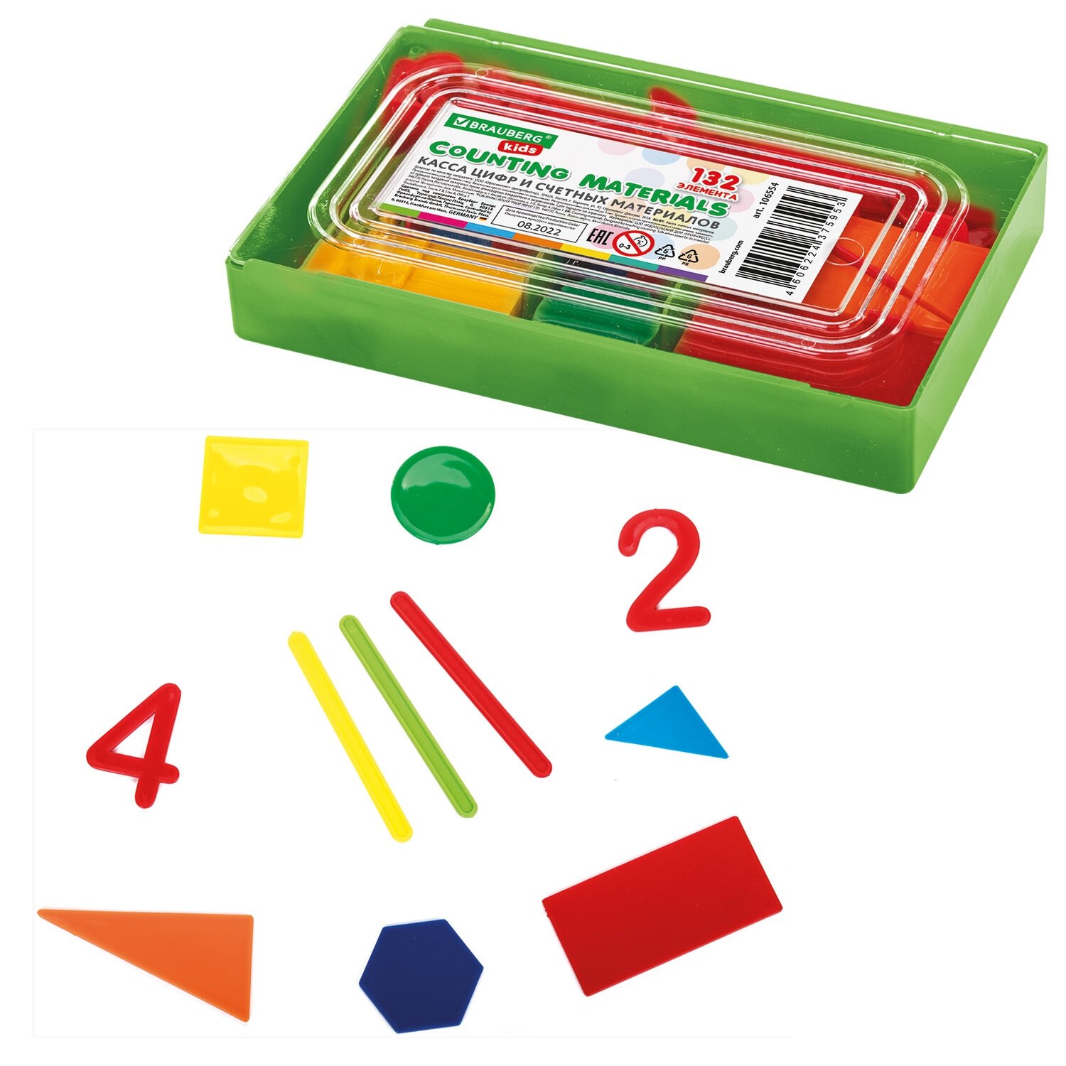 Касса цифр и счетных материалов 132 элемента, пенал в термоусадке, BRAUBERG KIDS, 106554
