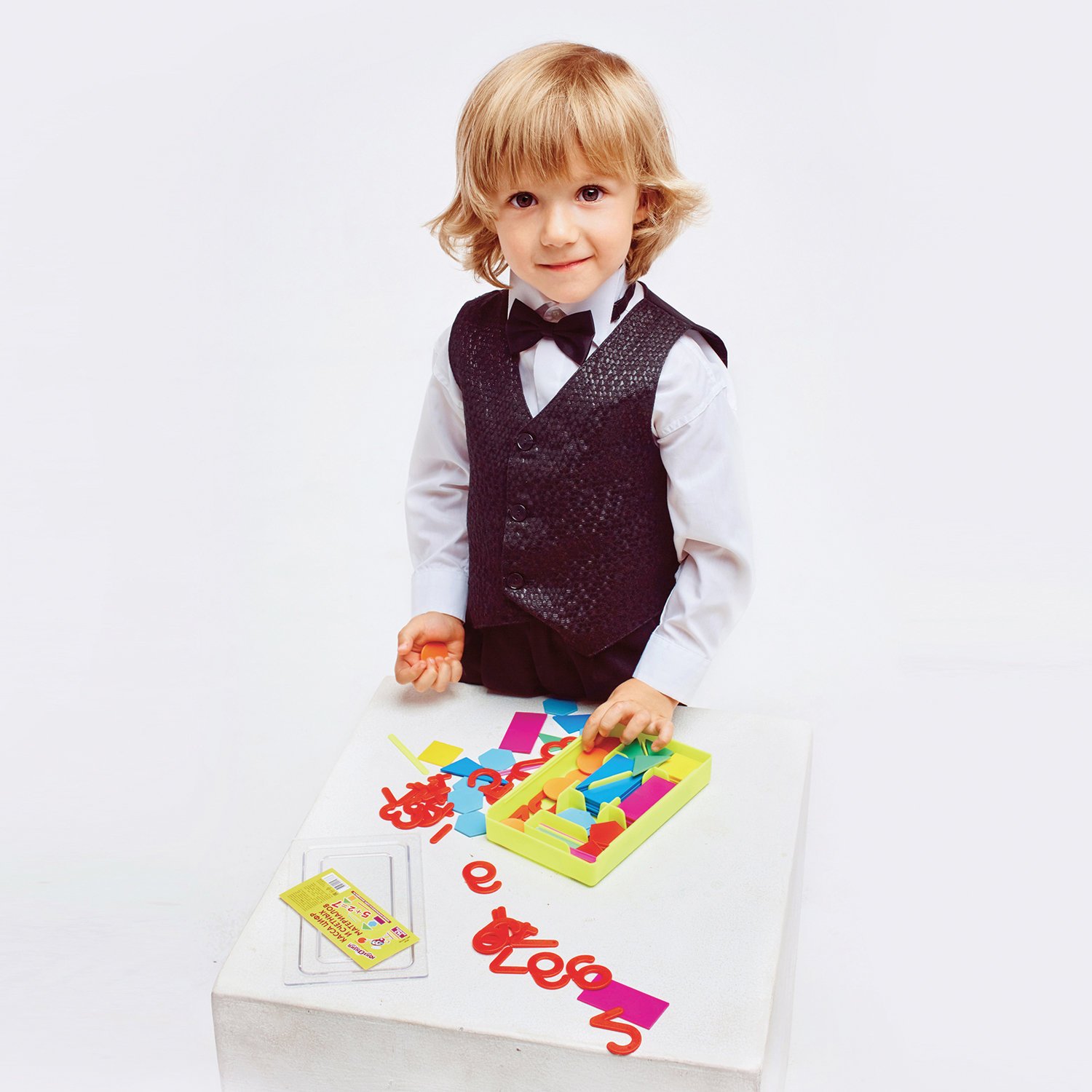 Элементы с закругленными углами изготовлены на современном оборудовании из пластика, безопасного для здоровья детей. Максимальная высота символа - 40 мм. Все элементы набора уложены в удобный пластиковый пенал со специальными перегородками, препятствующими перемешиванию деталей. Предназначен для детей старше 3-х лет.