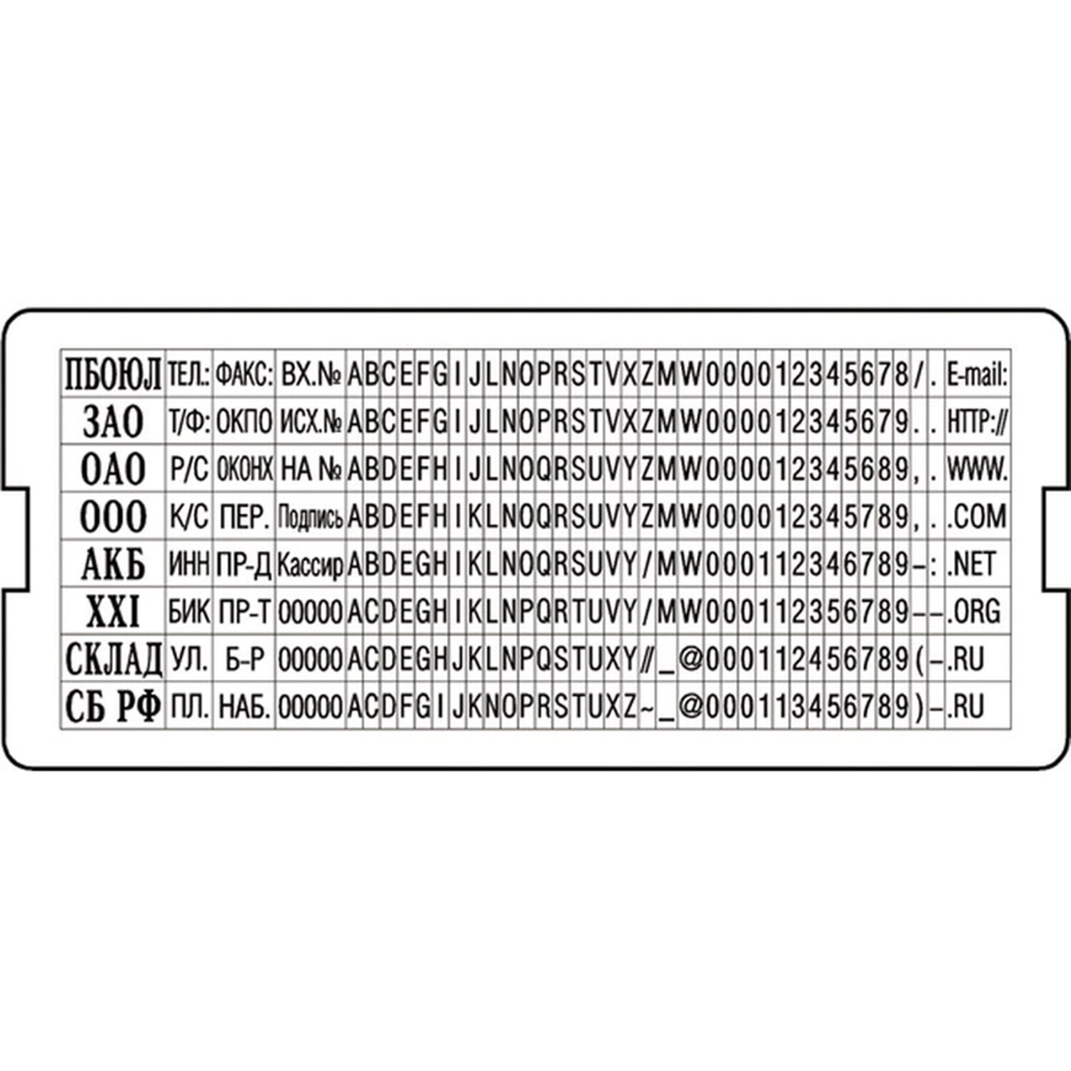Касса латински букв и цифр используется для набора текста в самонаборных печатях, штампах, датерах "Тродат".