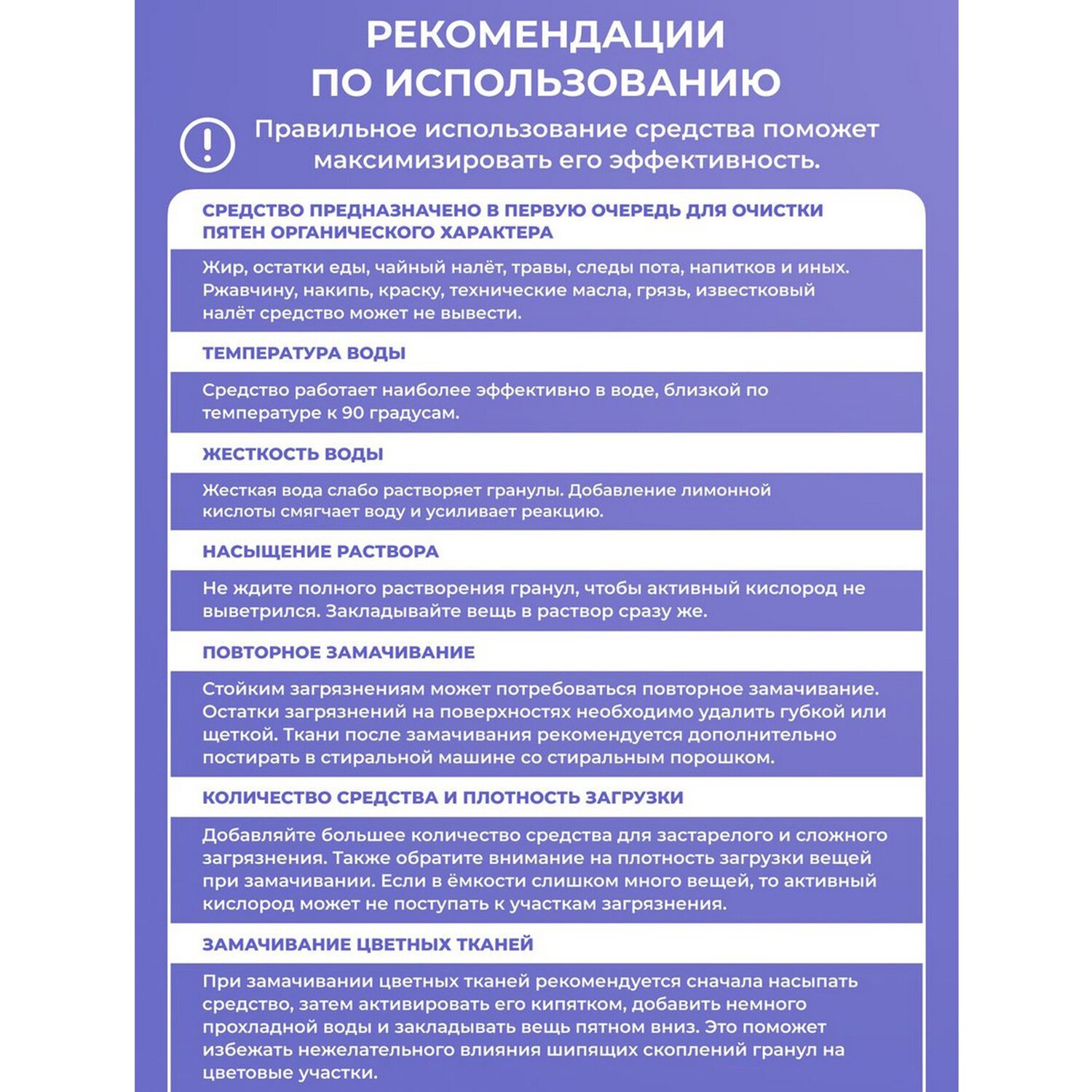 Для усиления действия порошка растворите 1,5 ст. ложки в 1 литре горячей воды (90 °C). При сложных загрязнениях рекомендуется предварительное замачивание, затем машинная стирка.