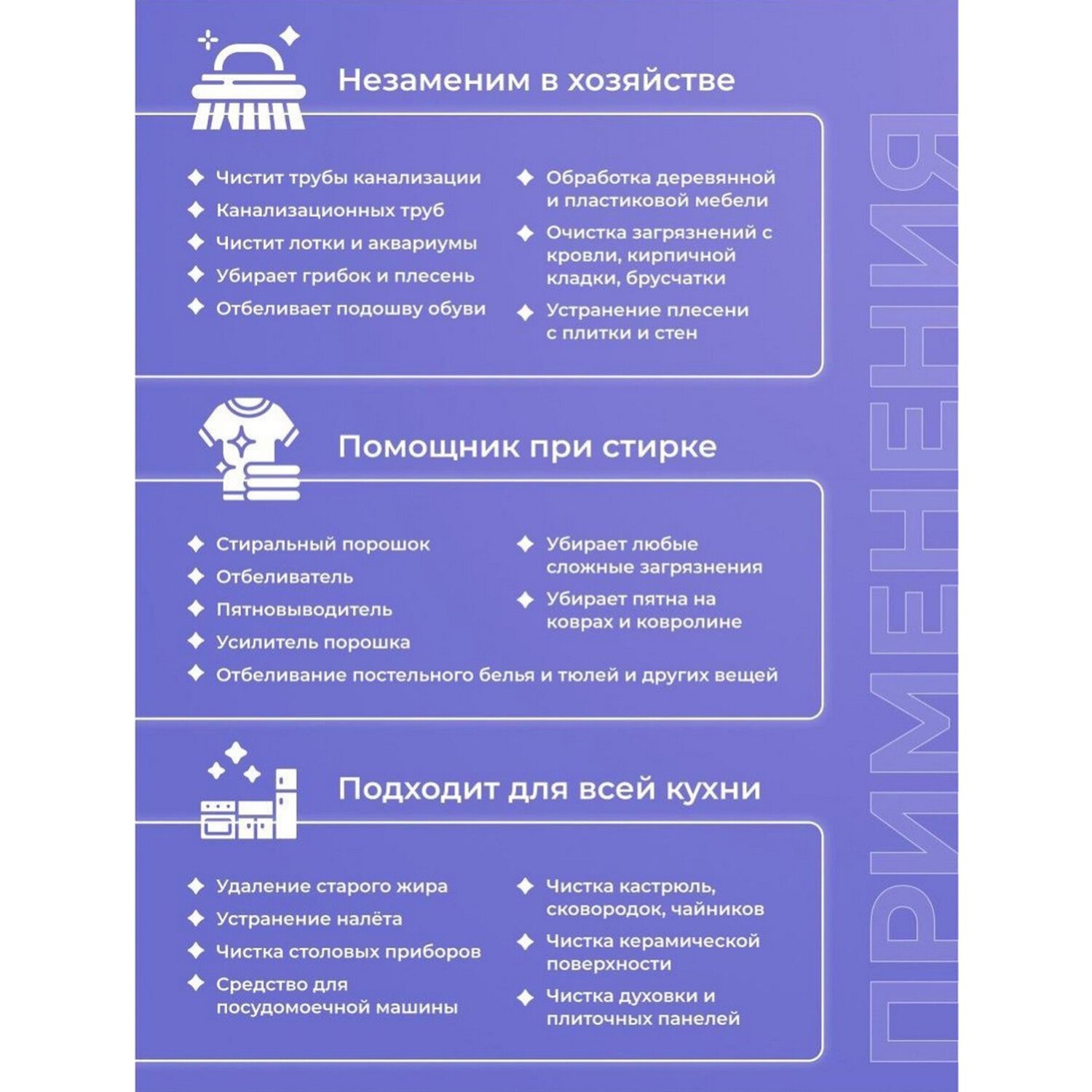 Подходит для стирки, уборки дома, чистки кухонных приборов, сантехники и текстиля.