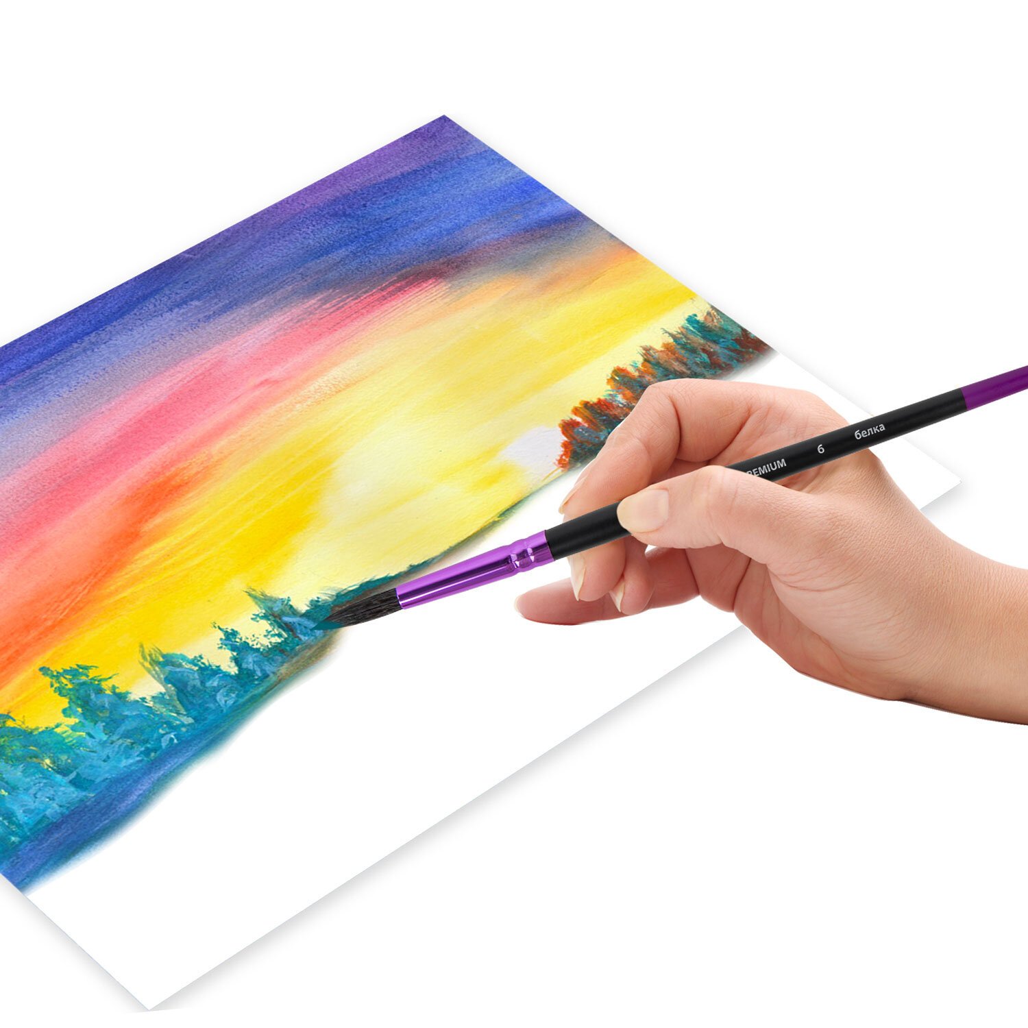 Кисть с круглой формой пучка № 6 позволит прорисовывать детали и наносить крупные мазки и линии. Пучок из ворса белки отлично впитывает и отдает краску, хорошо держит форму. Ручка из древесины покрыта лаком, что защищает ее от воздействия красок и влаги - кисть долговечна и надежна. Номер кисти соответствует реальной ширине пучка в миллиметрах.