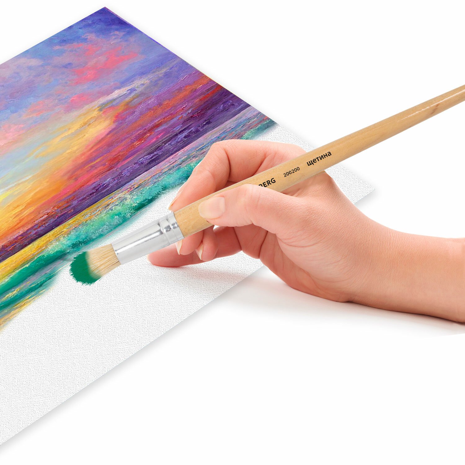 Кисть из щетины обладает высокой упругостью, хорошо держит форму, долговечна и надежна. Кисть № 12 позволит быстро заполнить фон, наносить крупные мазки и линии. Деревянную лакированную рукоятку кисти удобно держать в руке.