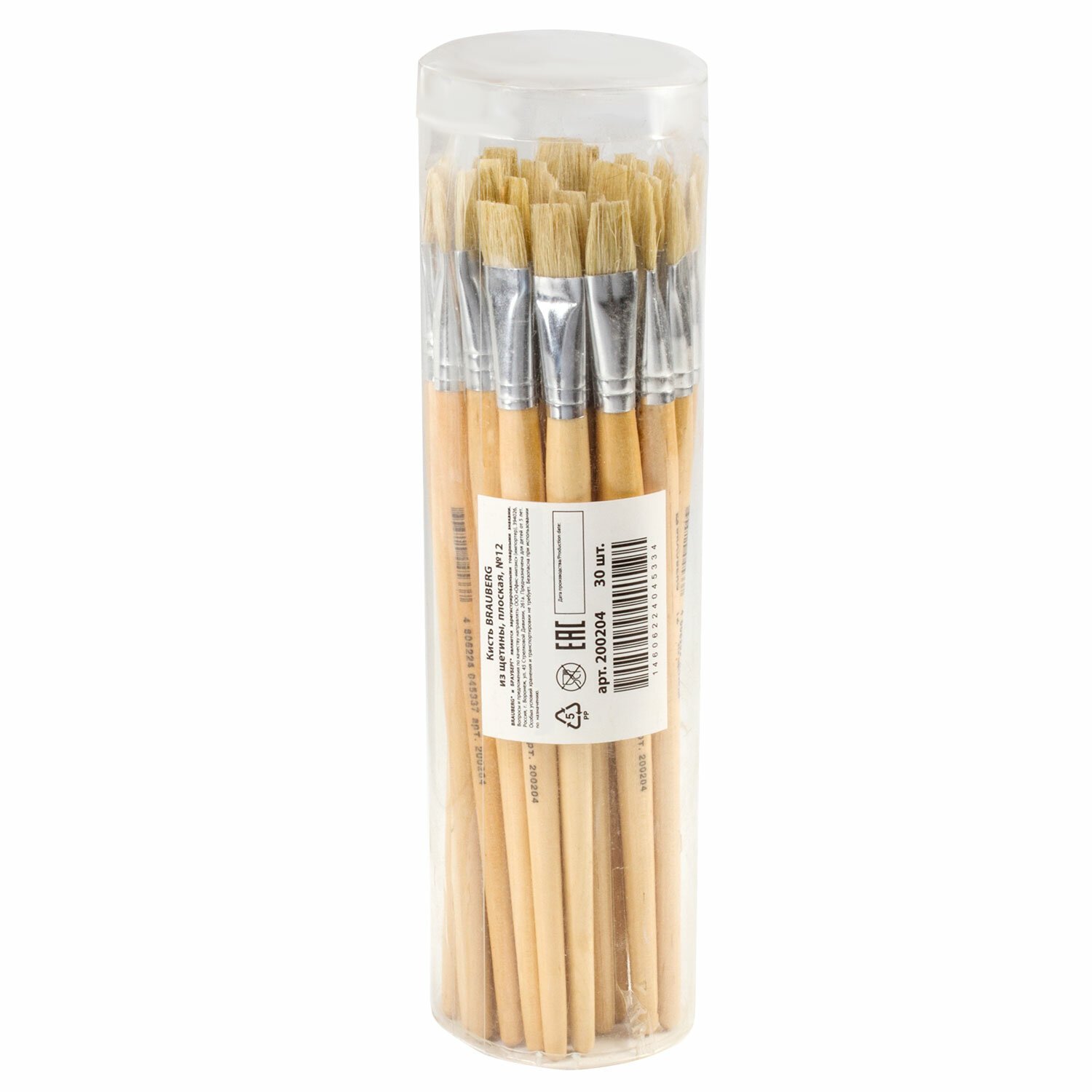 Кисть ПИФАГОР, ЩЕТИНА, плоская, № 12, деревянная лакированная ручка, пакет с подвесом, 200875