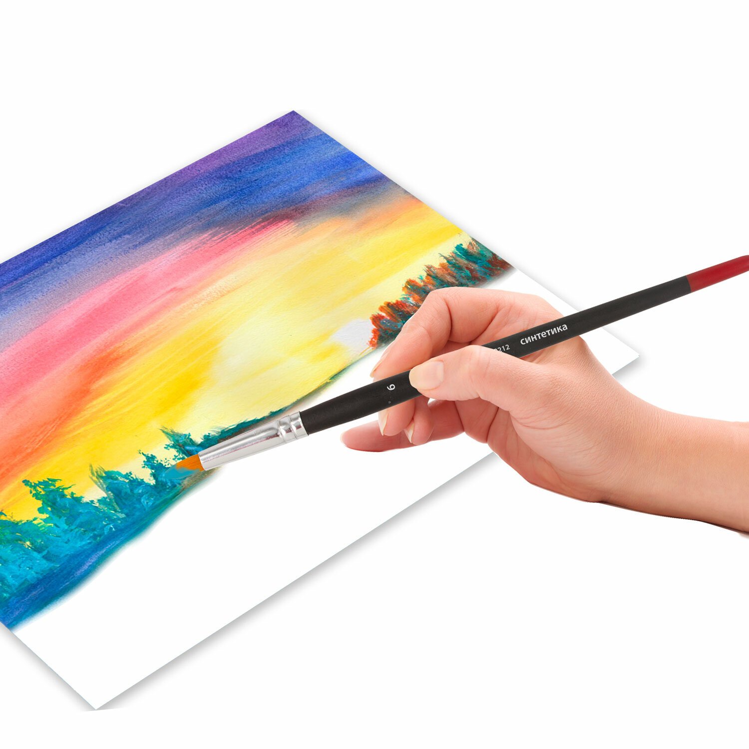 Кисть из синтетического ворса эластичная, не распадается, хорошо держит форму, долговечна и надежна. Кисть № 6 позволит прорисовывать детали и наносить крупные мазки и линии. Деревянную крашеную рукоятку кисти удобно держать в руке.
