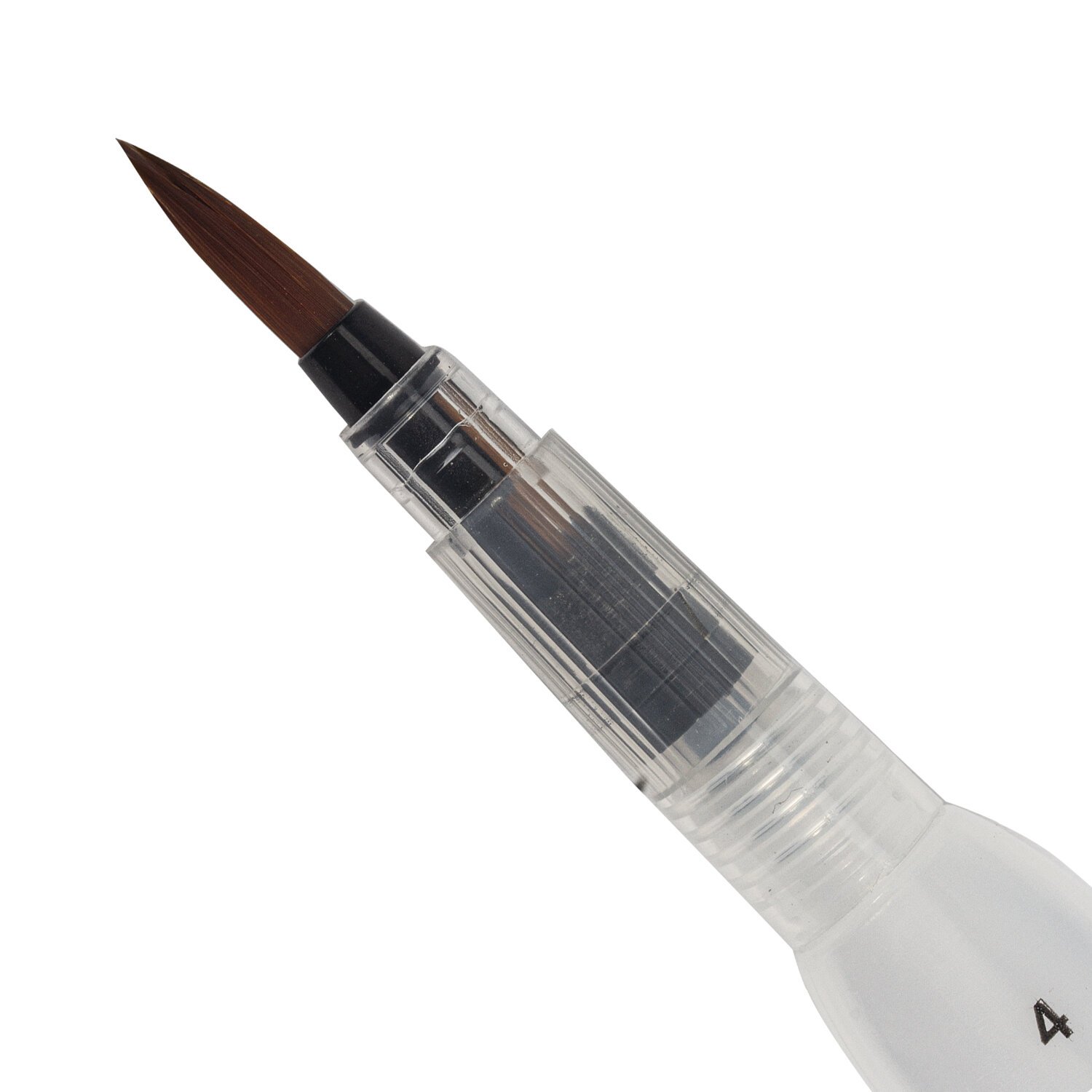 Кисть с резервуаром для воды или аквакисть изготовлена с применением высококачественной синтетики. Корпус кисти выполнен из пластмассы белого цвета. Короткая ручка, номер кисти - 4.