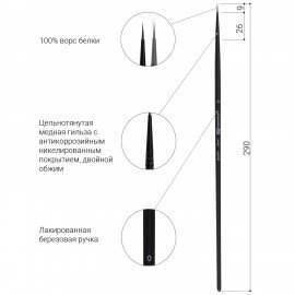 Длинная ручка покрыта лаком, что защищает ее от воздействия красок и влаги. Форма пучка – круглая. Ширина ворса у основания кисти – 0,8 мм. Упаковка – пакет с европодвесом и картонной подложкой.