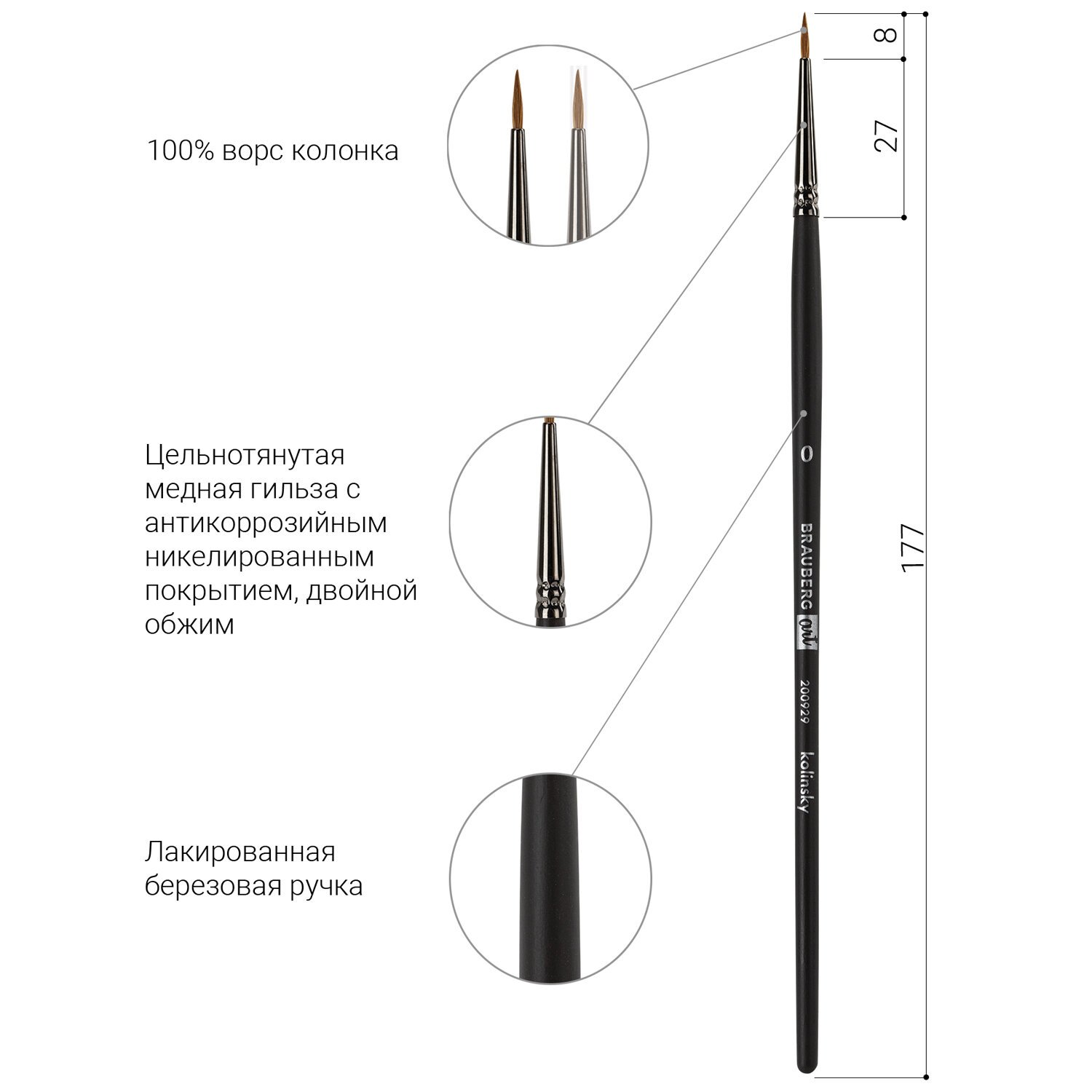 Кисти из колонка отлично впитывают и отдают краску, хорошо держат форму, долговечны и надежны. Кисть № 0 позволит комфортно прорисовывать мелкие детали. Короткая ручка покрыта лаком, что защищает ее от воздействия красок и влаги. Форма пучка – круглая. Ширина ворса у основания кисти – 0,8 мм. Упаковка – пакет с европодвесом и картонной подложкой.