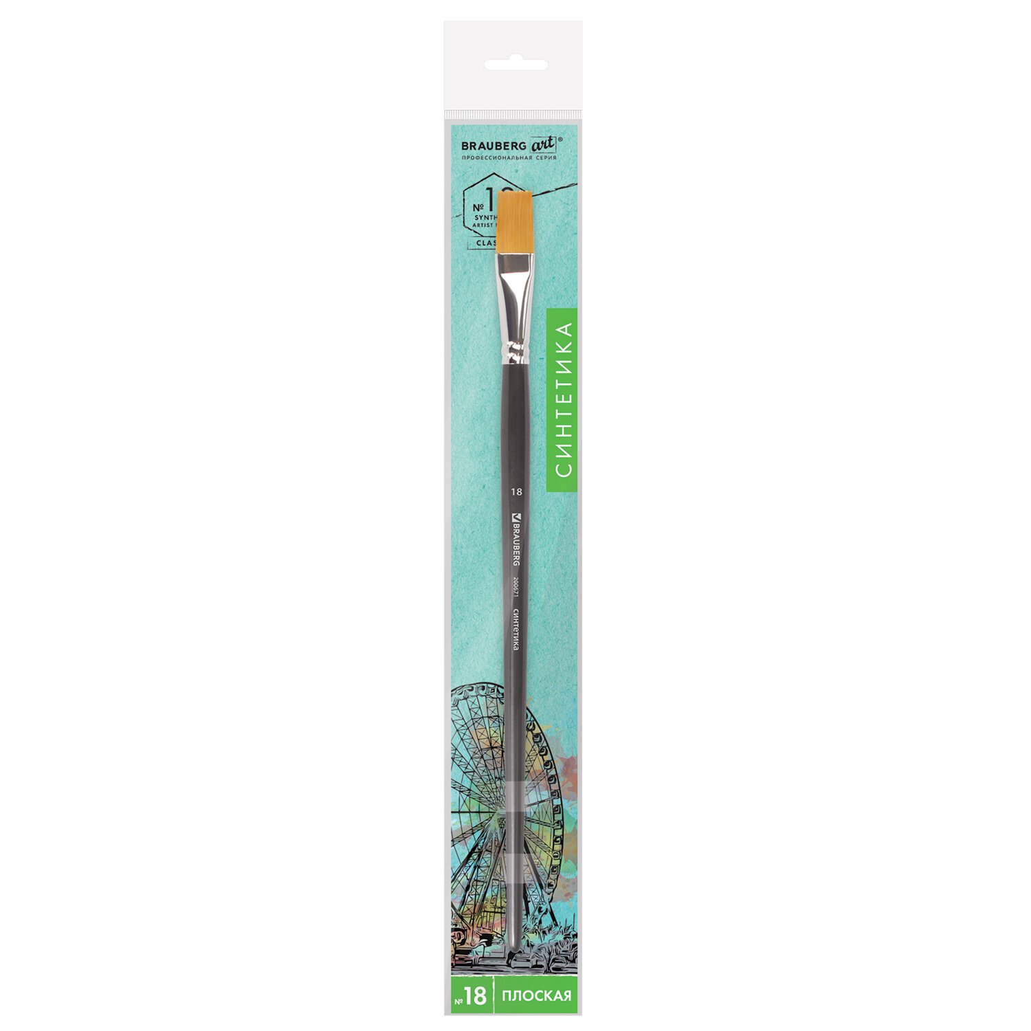 Кисть художественная проф. BRAUBERG ART CLASSIC, синтетика жесткая, плоская, № 18, длинная ручка, 200671