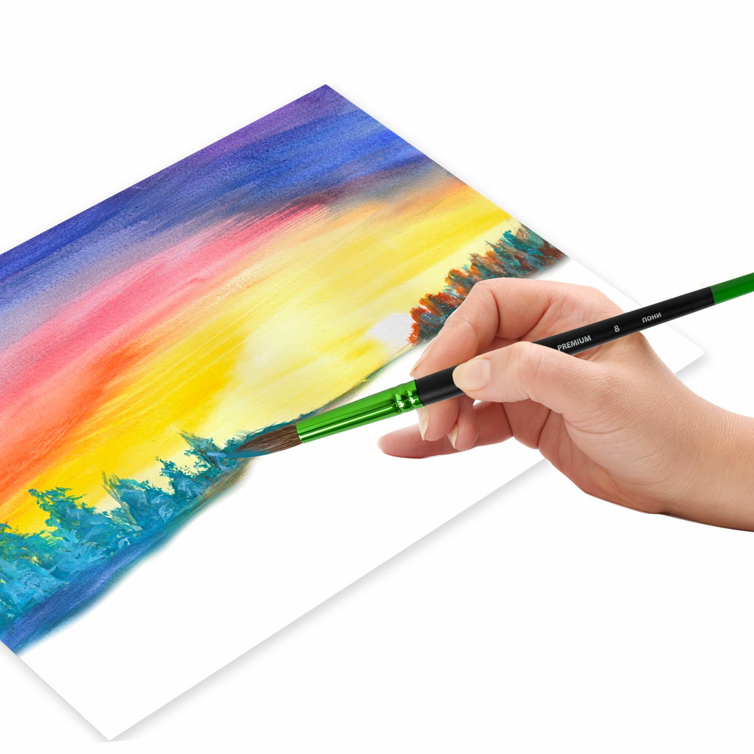 Кисть с круглой формой пучка № 8 позволит прорисовывать детали и наносить крупные мазки и линии. Пучок из ворса пони отлично впитывает и отдает краску, хорошо держит форму. Ручка из древесины покрыта лаком, что защищает ее от воздействия красок и влаги – кисть долговечна и надежна. Номер кисти соответствует реальной ширине пучка в миллиметрах.