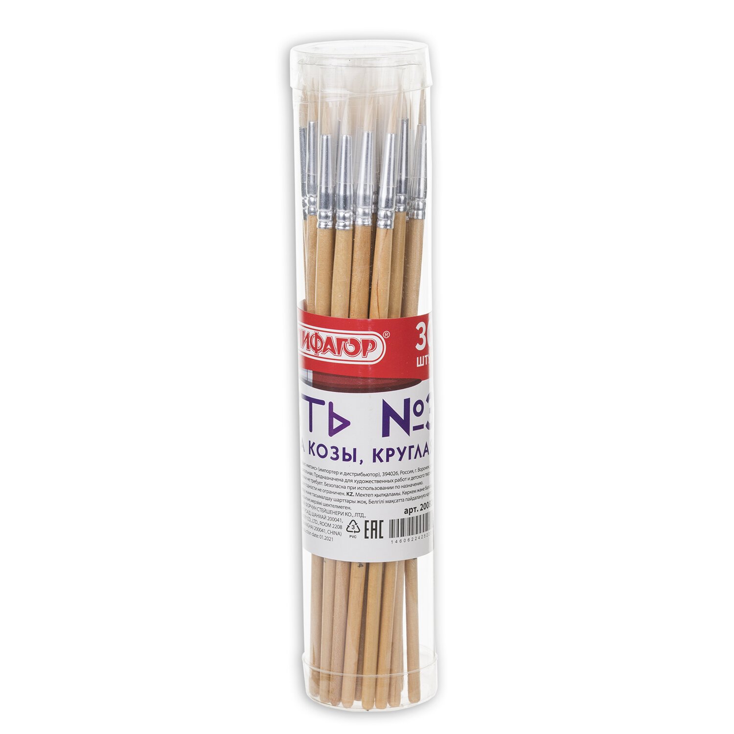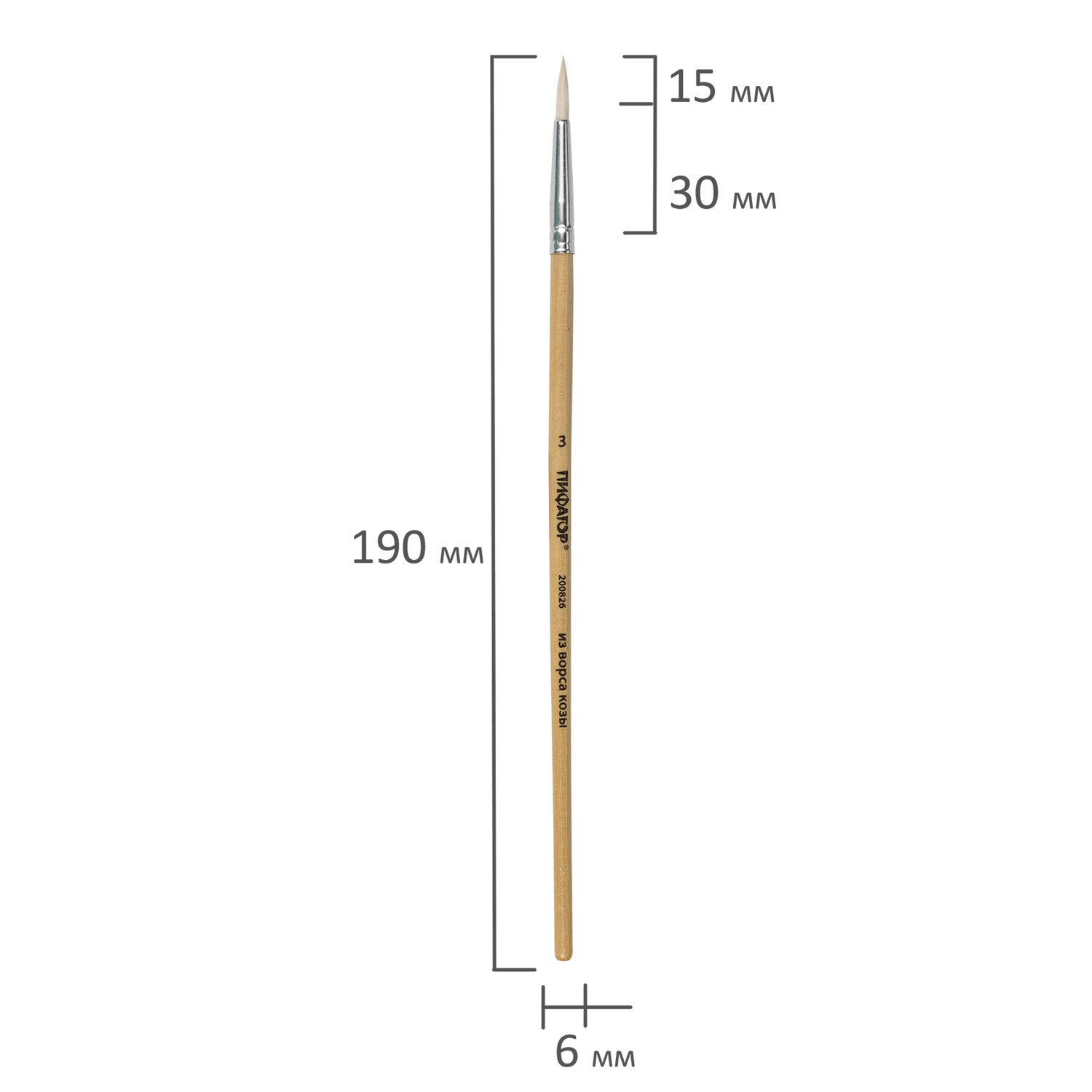 Кисть ПИФАГОР, КОЗА, круглая, № 3, деревянная лакированная ручка, с колпачком, 200826