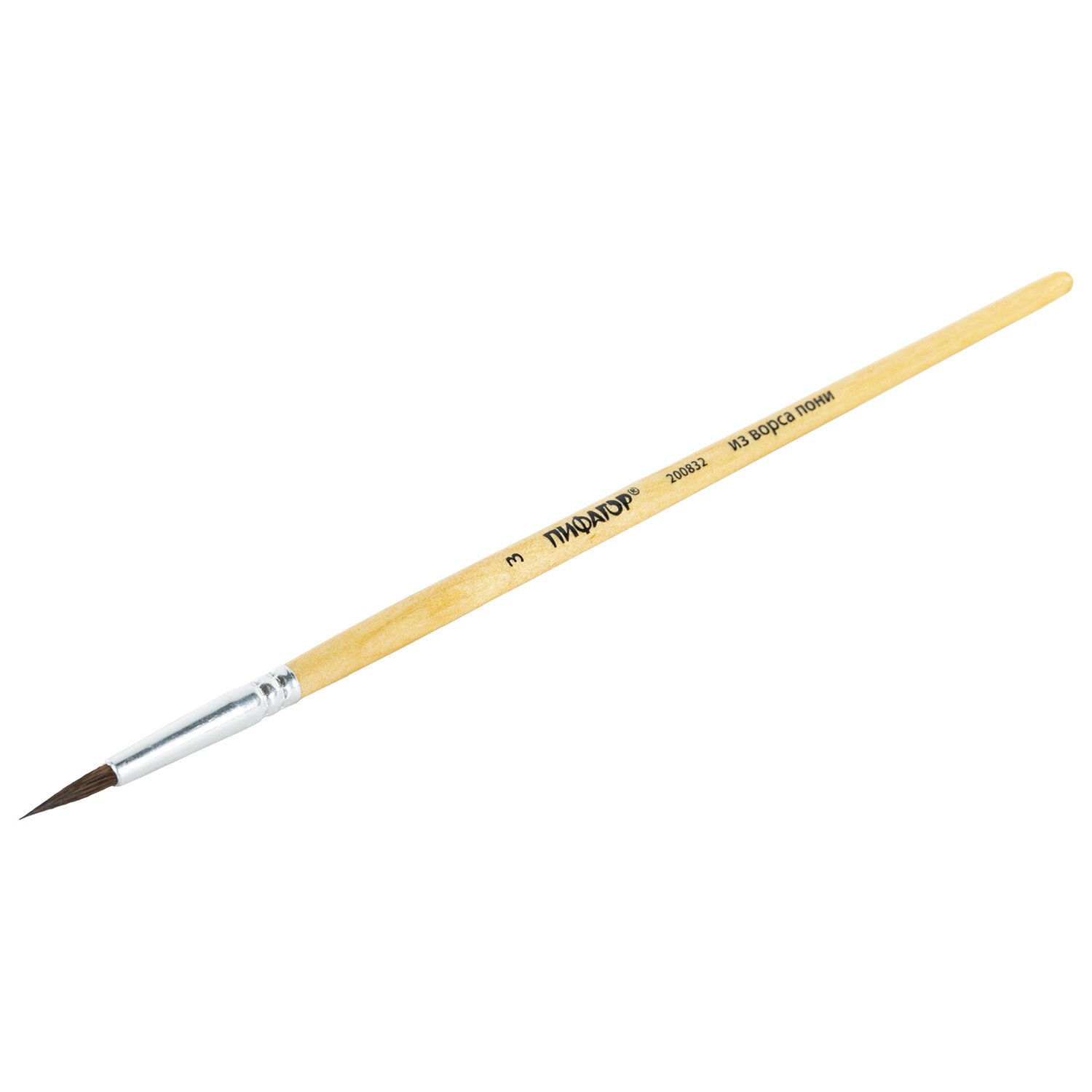 Кисть ПИФАГОР, ПОНИ, круглая, № 3, деревянная лакированная ручка, с колпачком, 200832
