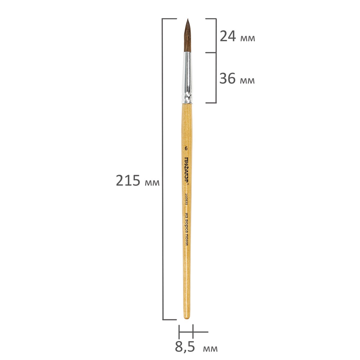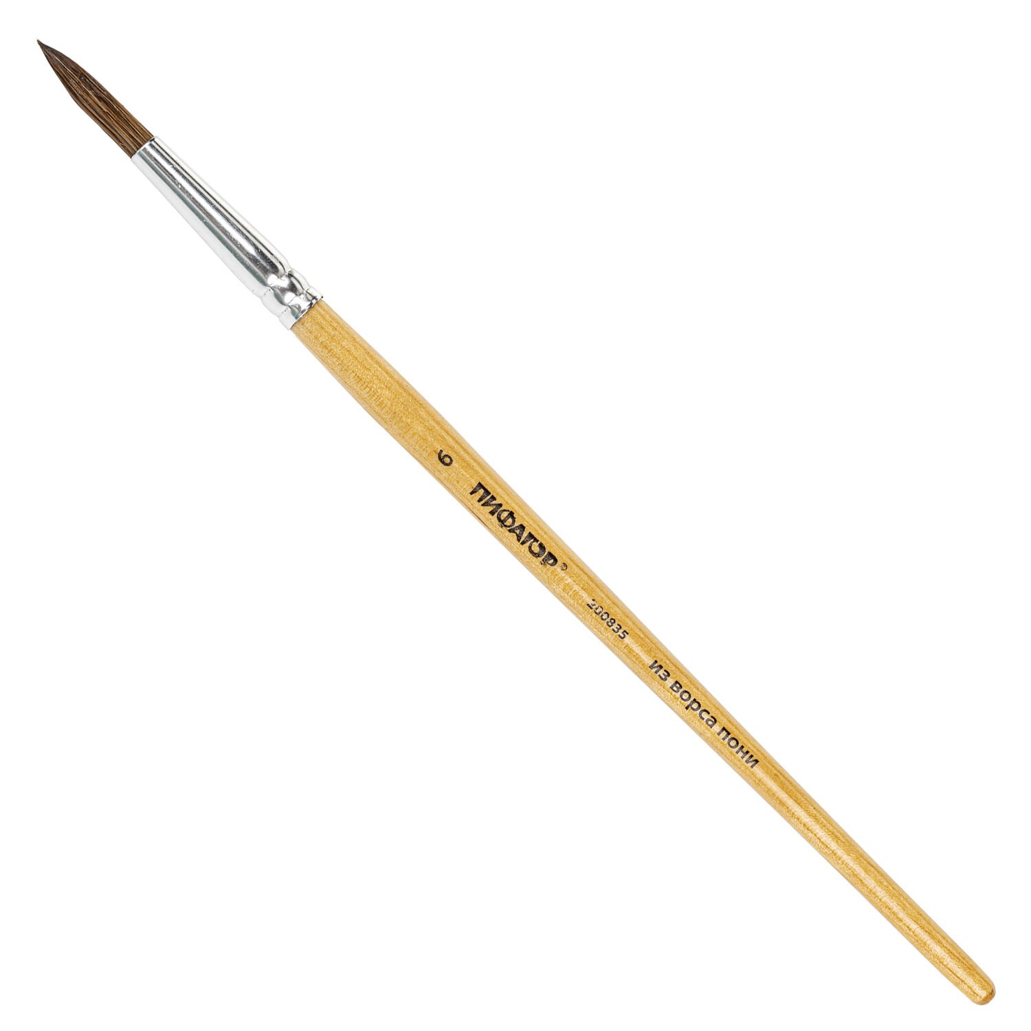 Кисть ПИФАГОР, ПОНИ, круглая, № 6, деревянная лакированная ручка, колпачок, пакет с подвесом, 200835