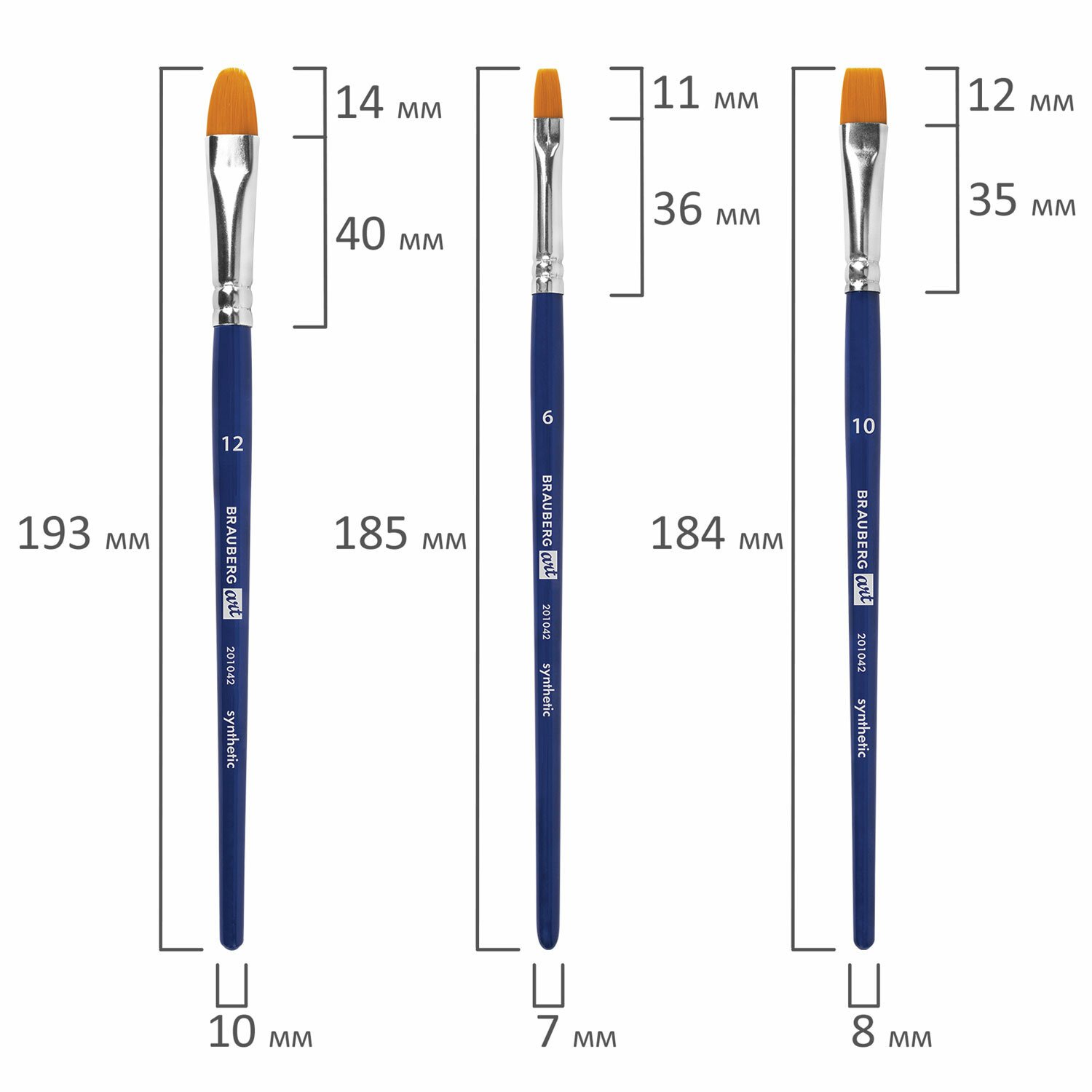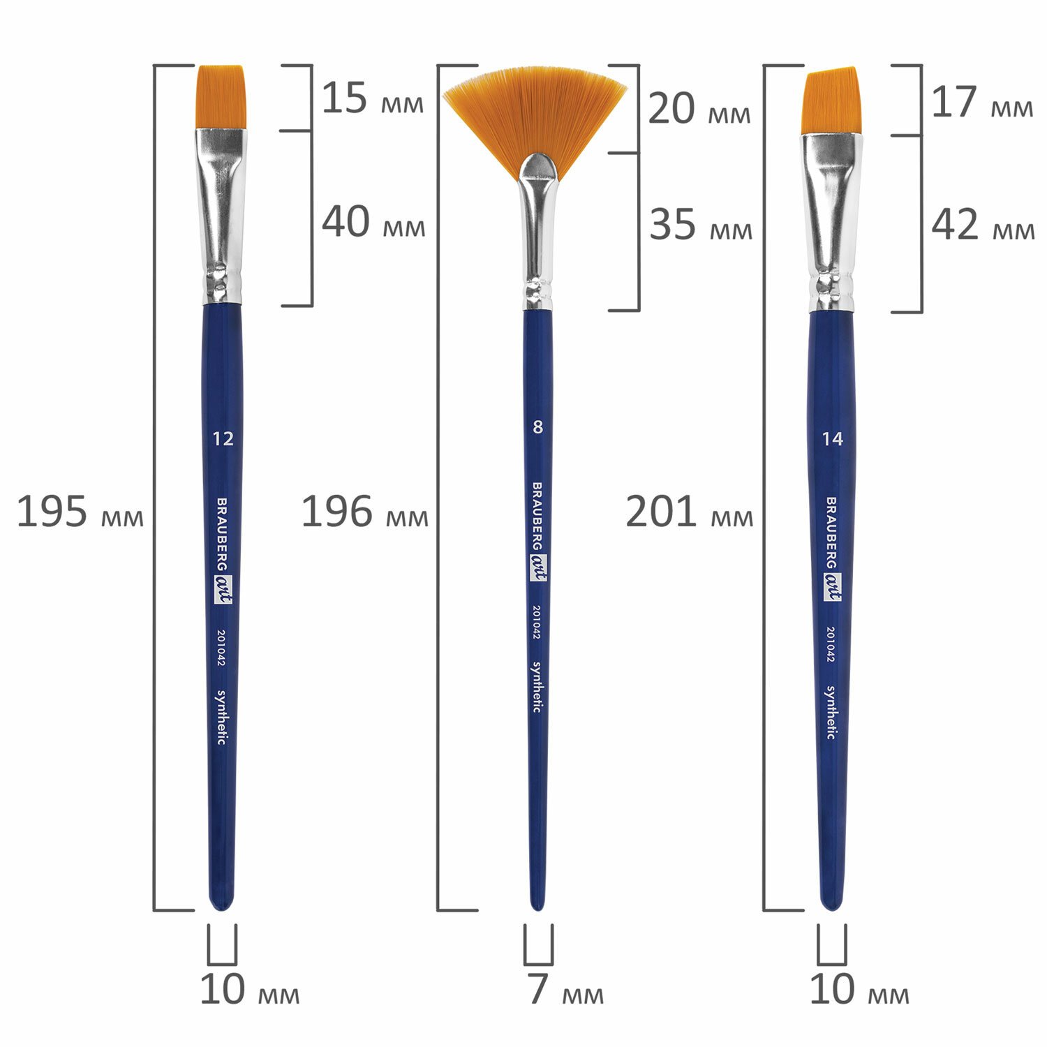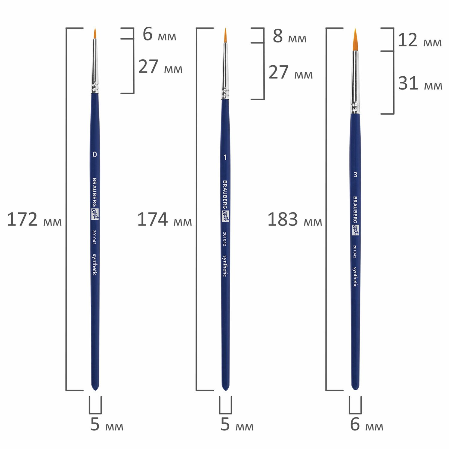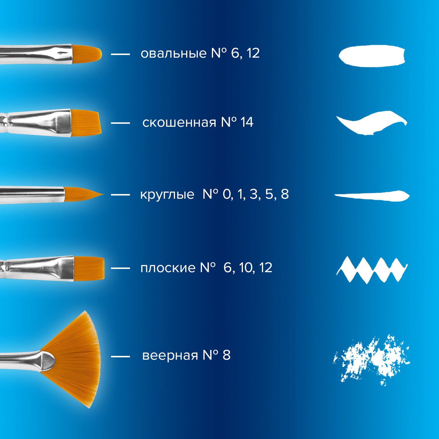 | Номер кисти | круглая № 0, 1, 3, 5, 9; плоская № 6, 10, 12; скошенная № 12; овальная № 6, 12; веерная № 8 |