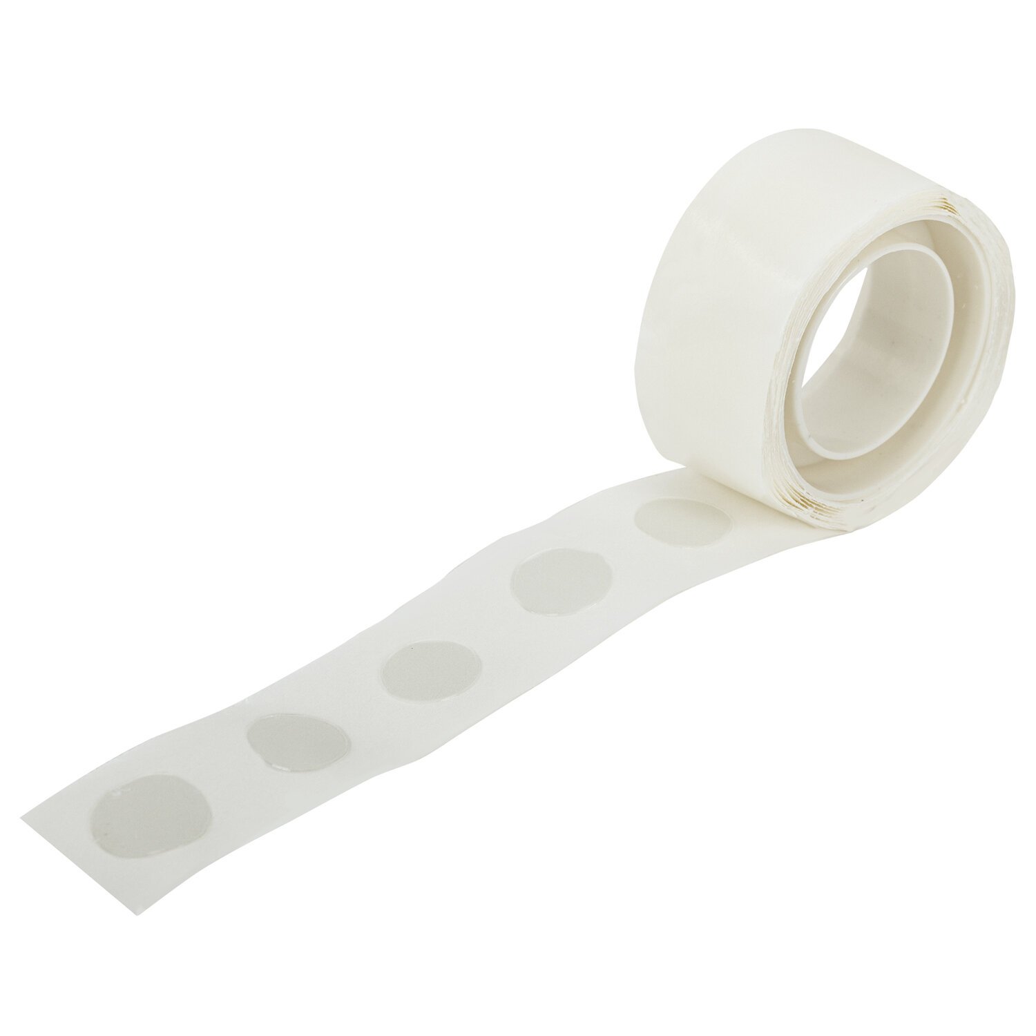 Двусторонние клеевые точки представляют собой ленту из мелованной бумаги, на которую нанесен клейкий слой силиконового клея-герметика в виде точек диаметром 1 см в количестве 100 штук. Лента намотана на втулку из полипропилена.