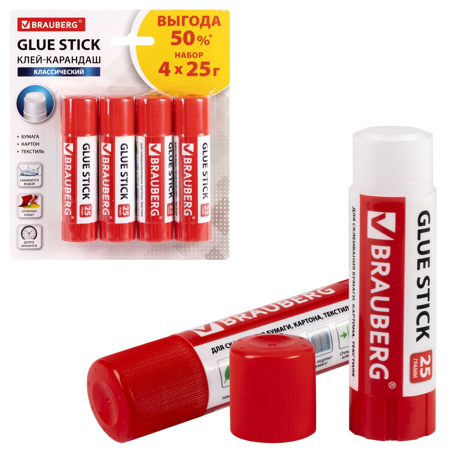 Клей-карандаш 25 г ВЫГОДНАЯ УПАКОВКА BRAUBERG, 4 штуки на блистере, 229472