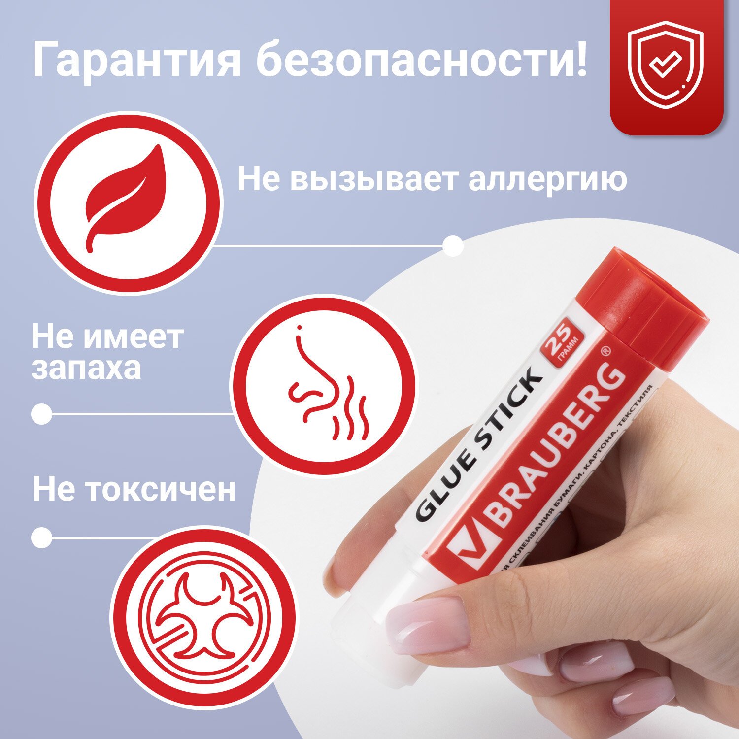 После нанесения высыхает без образования пятен. Не токсичен, не вызывает аллергии и безопасен для здоровья. Легко наносится и распределяется по поверхности, оставляя тонкий и ровный клеевой слой, что позволяет расходовать его экономично. Клей удобен в использовании. Он не пачкает руки, стол, одежду, не попадает на участки бумаги, расположенные возле места склеивания. Увеличенный срок годности — 5 лет.