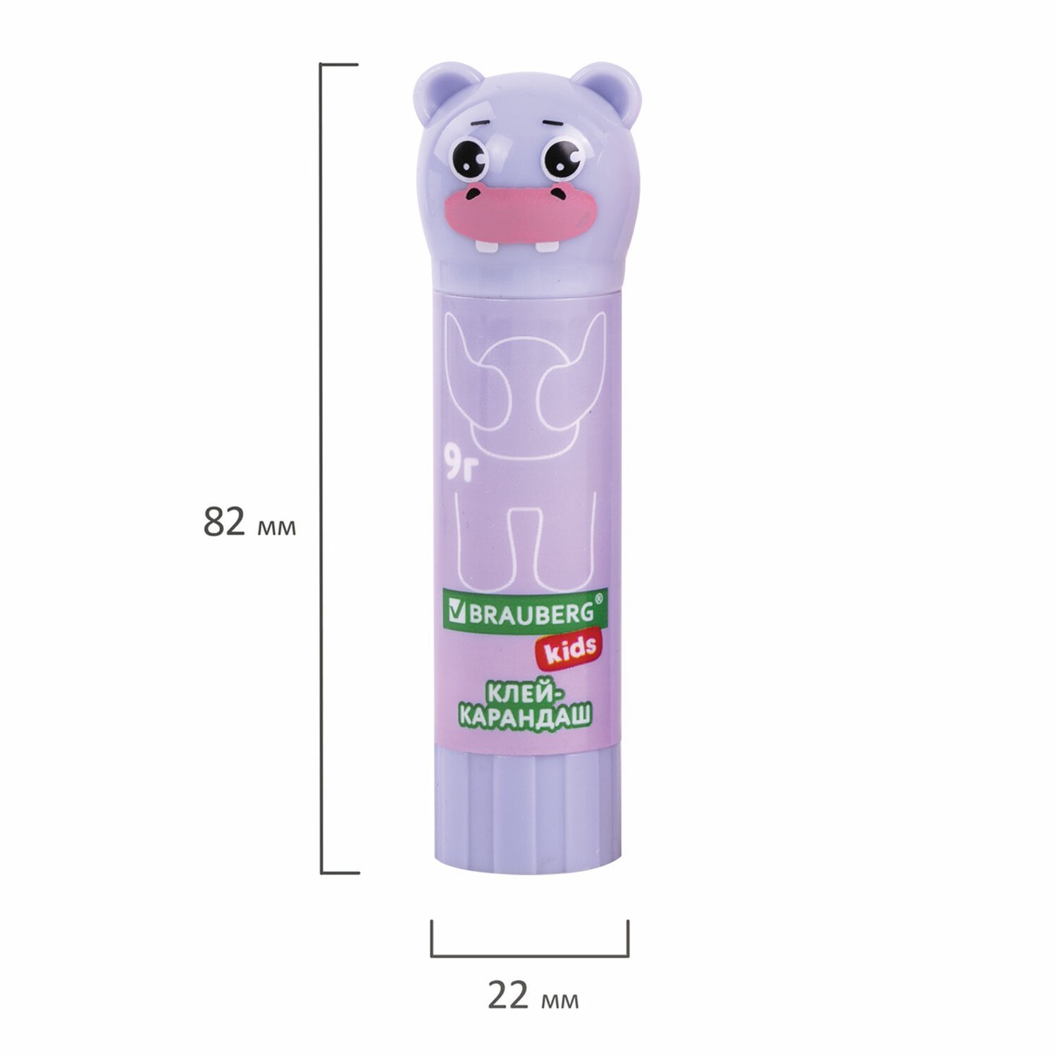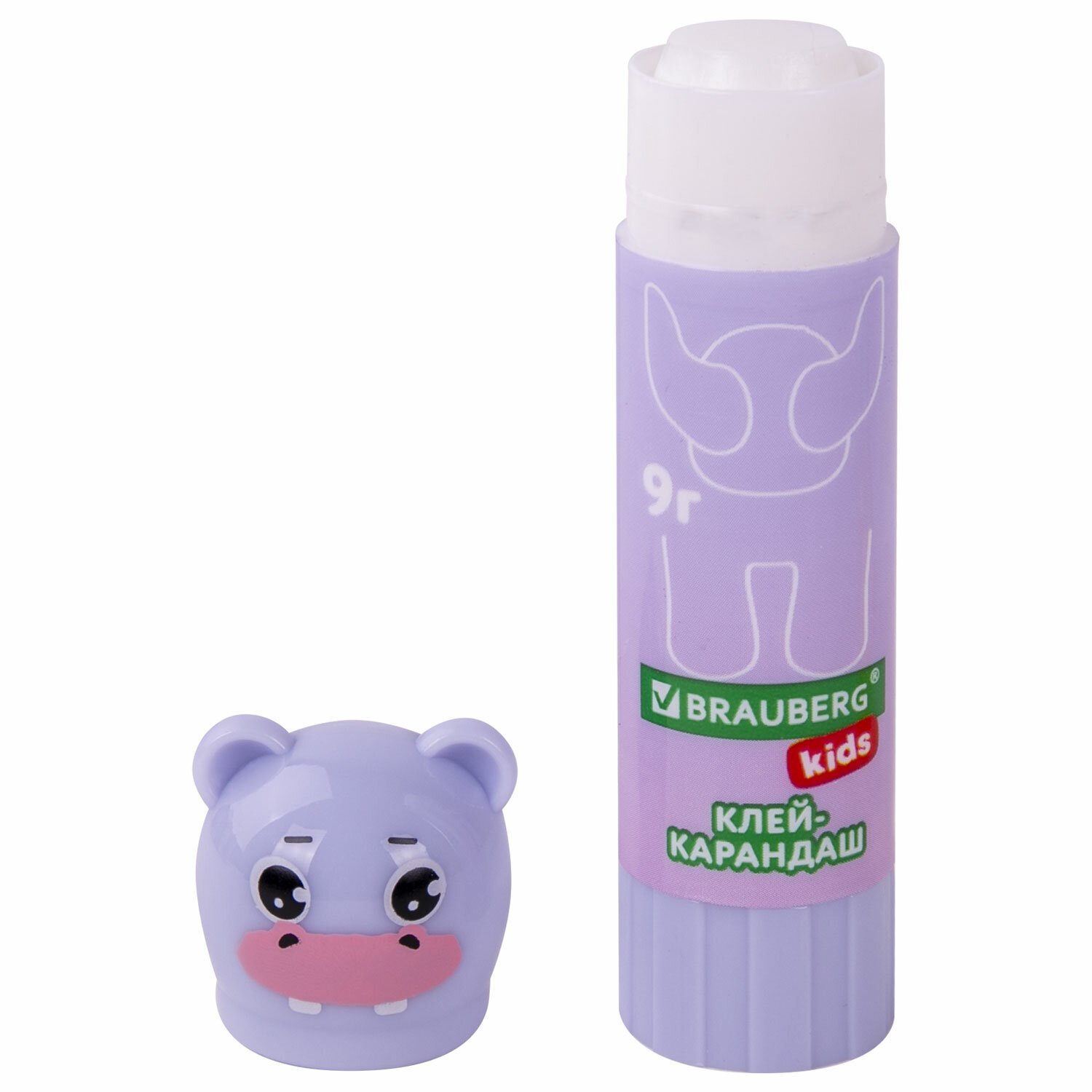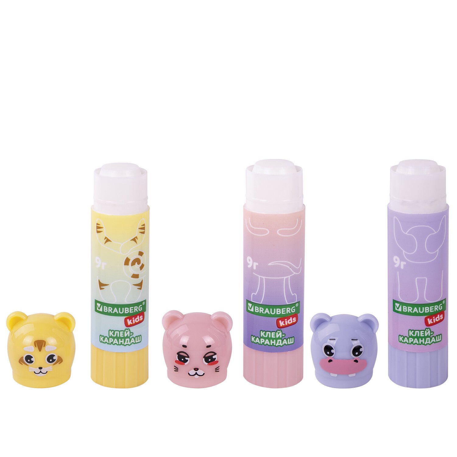 Клей-карандаш "Пастельные зверята: мышка, тигр, бегемот", 9 г, фигурный колпачок, BRAUBERG KIDS, 271140