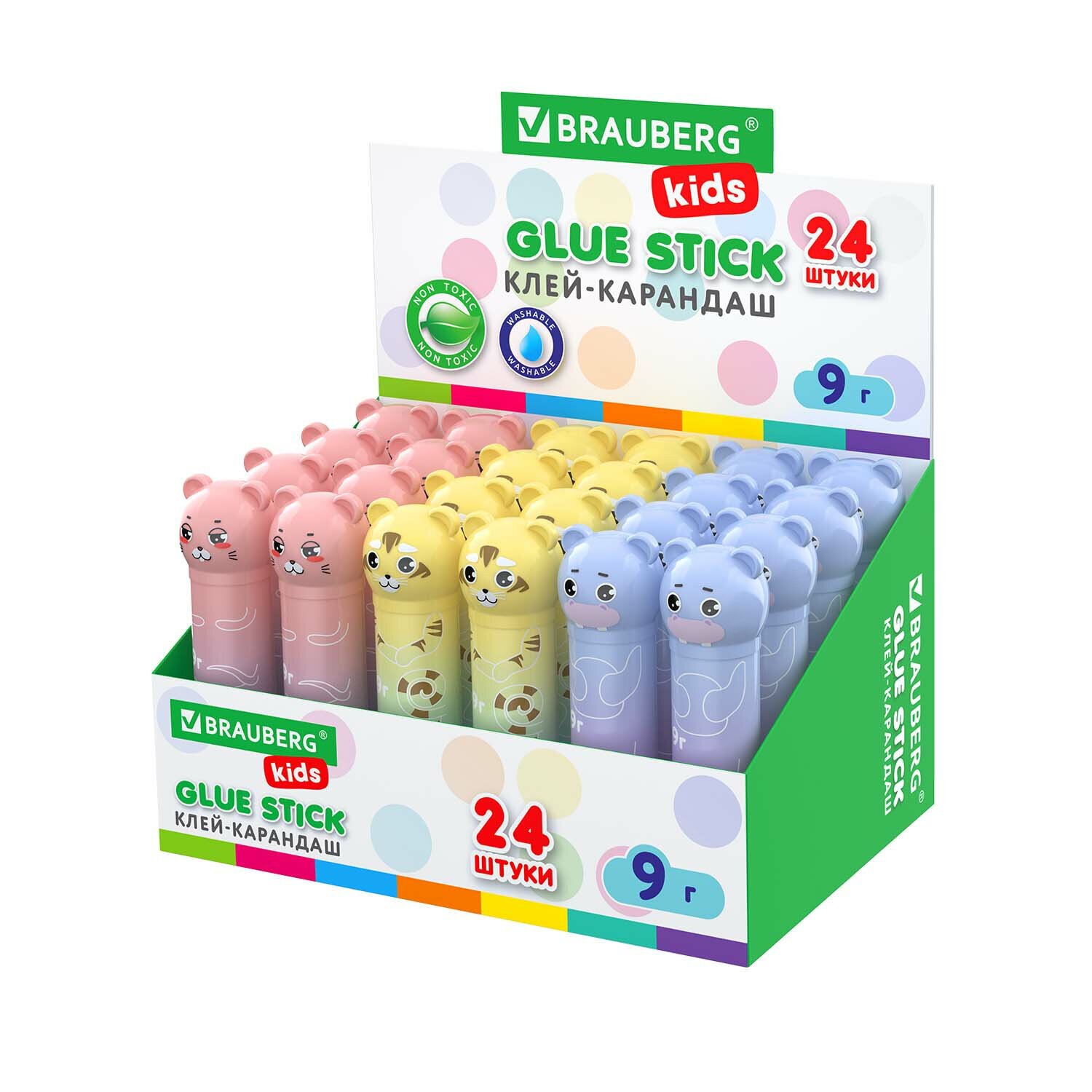 Пастельная линейка клей-карандаша BRAUBERG KIDS "Пастельные зверята: мышка, тигр, бегемот" с колпачком в виде животных идеально подходит для занятий творчеством в игровой форме в детском саду, школе и дома.