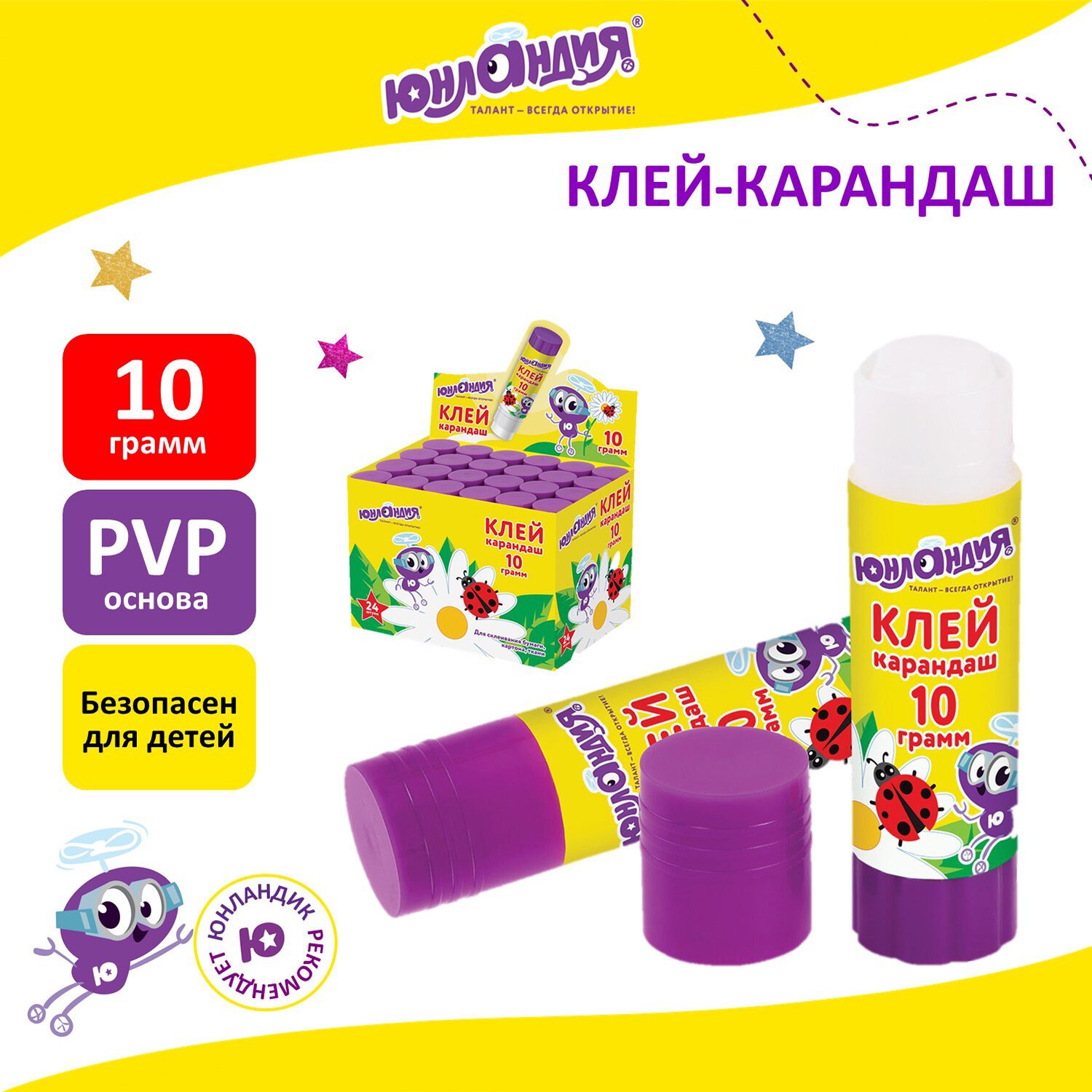 Клей-карандаш ЮНЛАНДИЯ "ЮНЛАНДИК И БОЖЬЯ КОРОВКА", 10 г, улучшенный, 271137