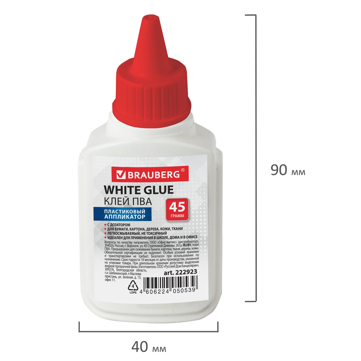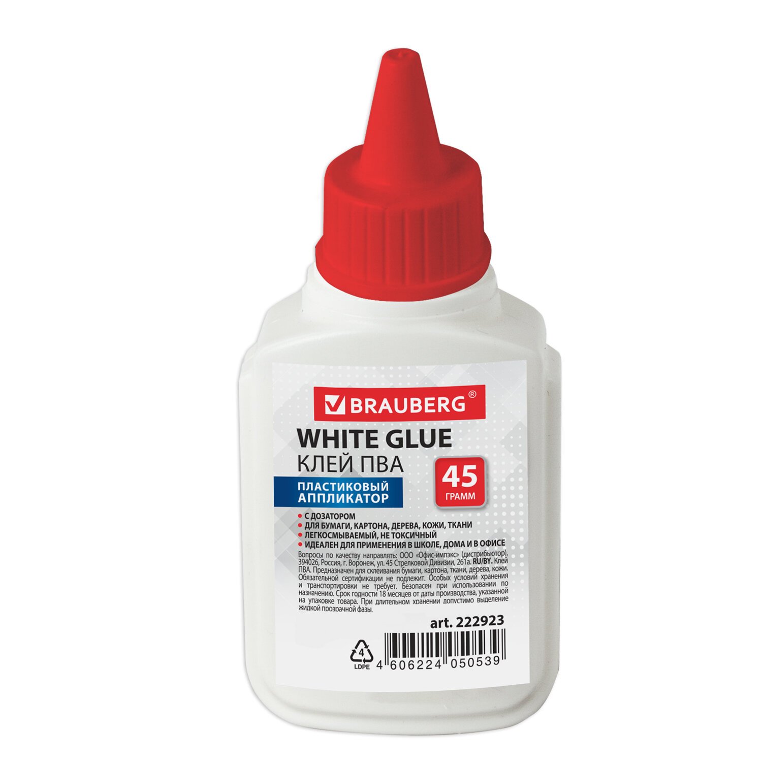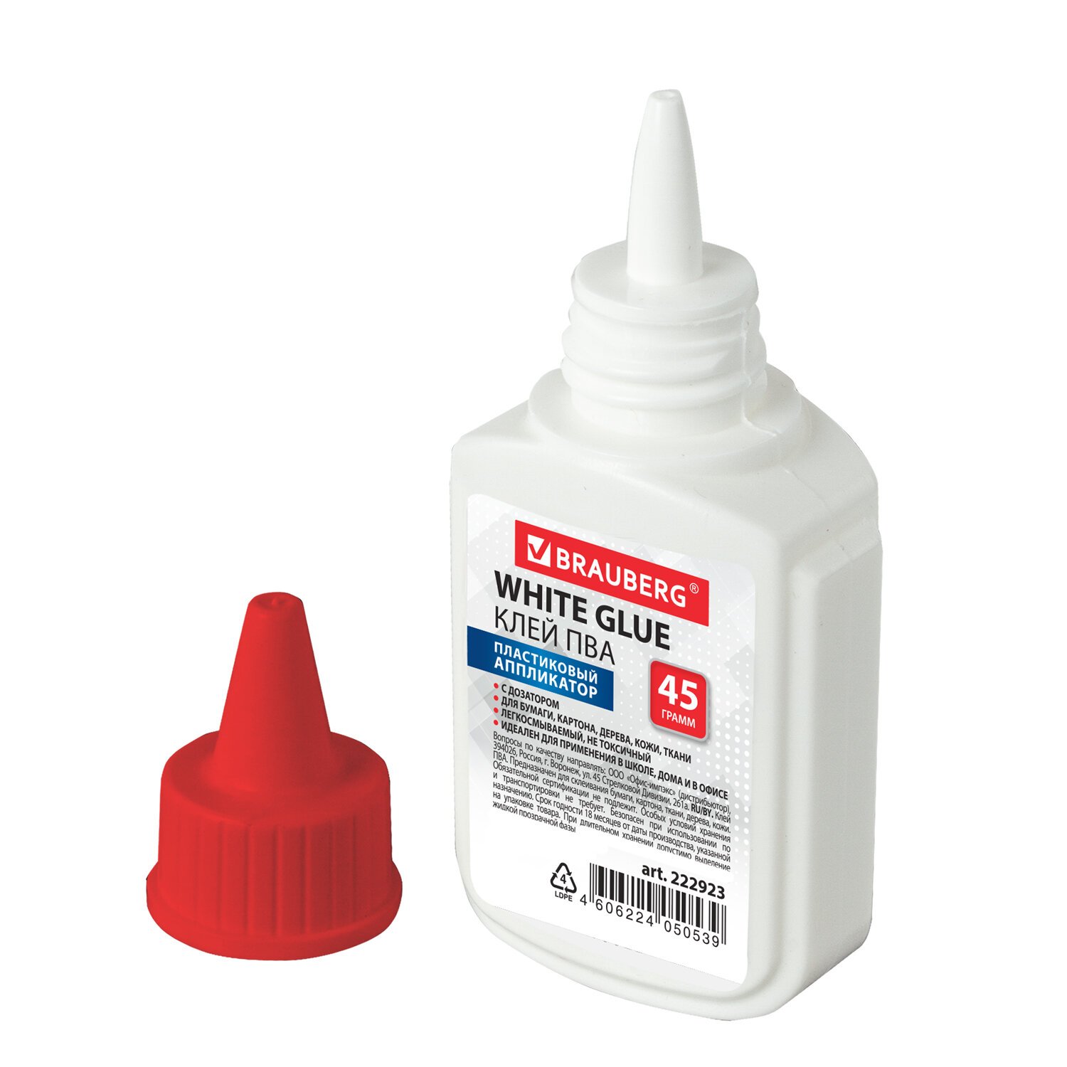 Клей ПВА BRAUBERG (бумага, картон, дерево), 45 г, 222923