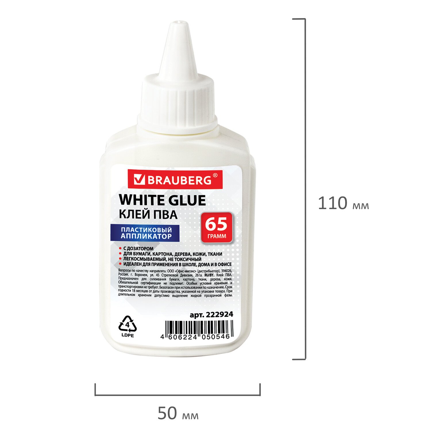 Клей ПВА BRAUBERG (бумага, картон, дерево), 65 г, 222924
