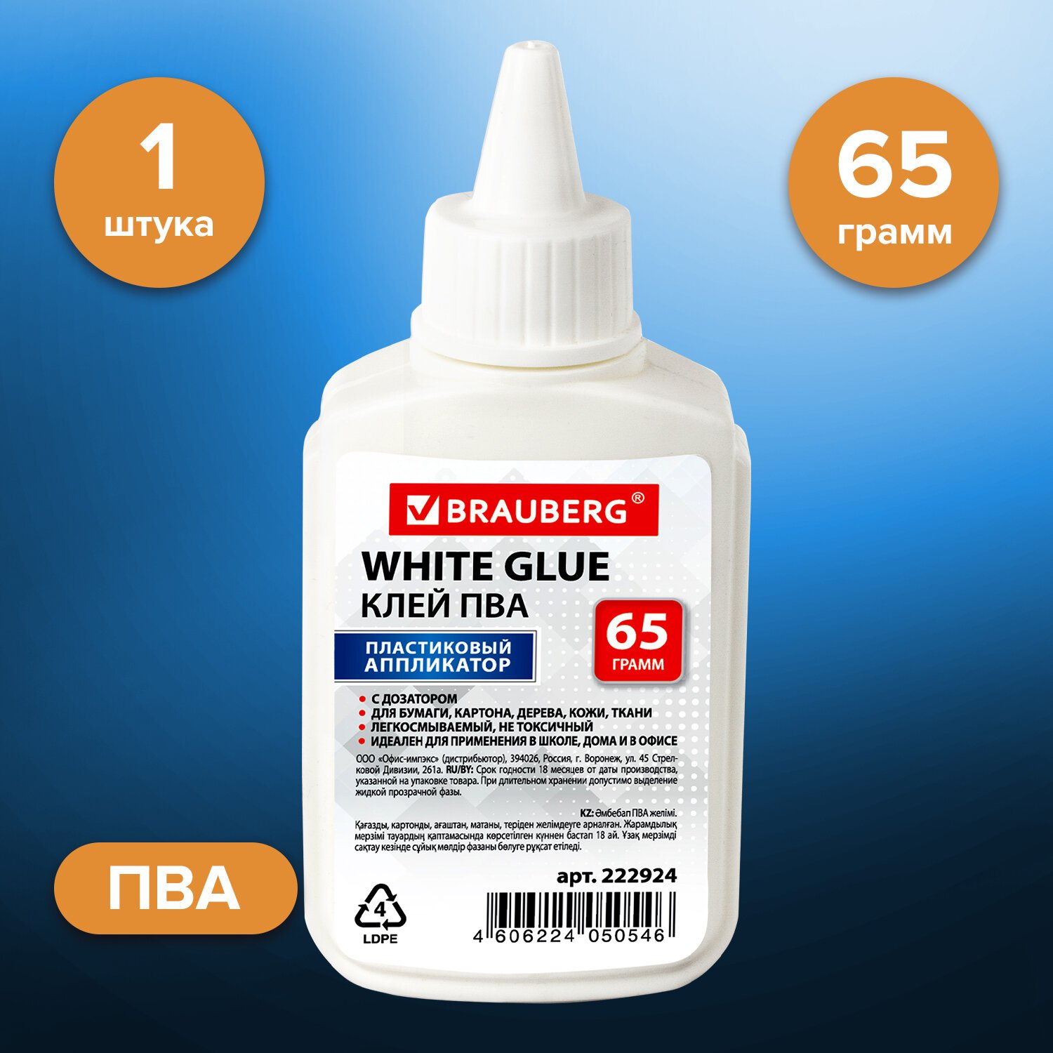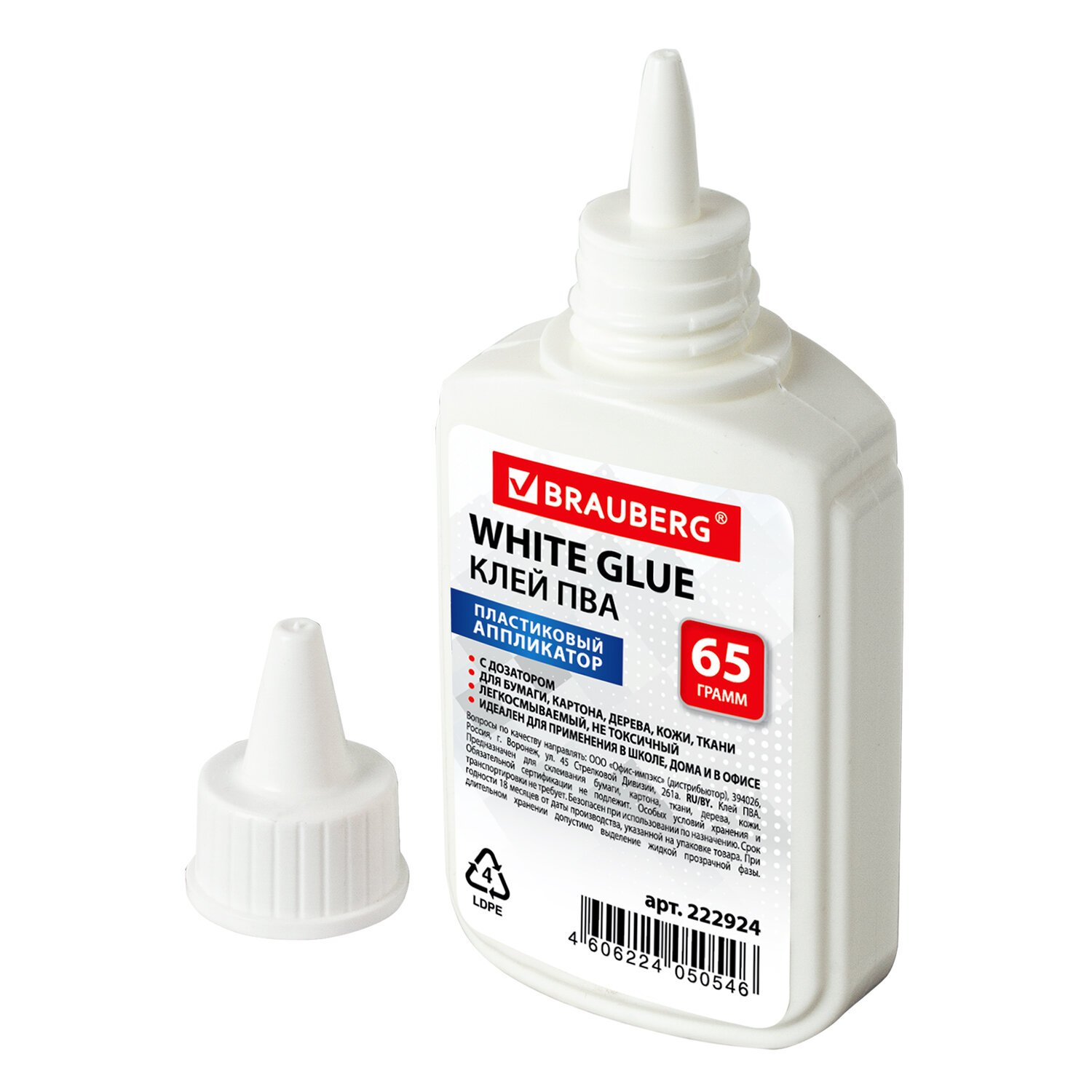 Клей ПВА BRAUBERG предназначен для склеивания бумаги, картона, фотографий, дерева и кожи.