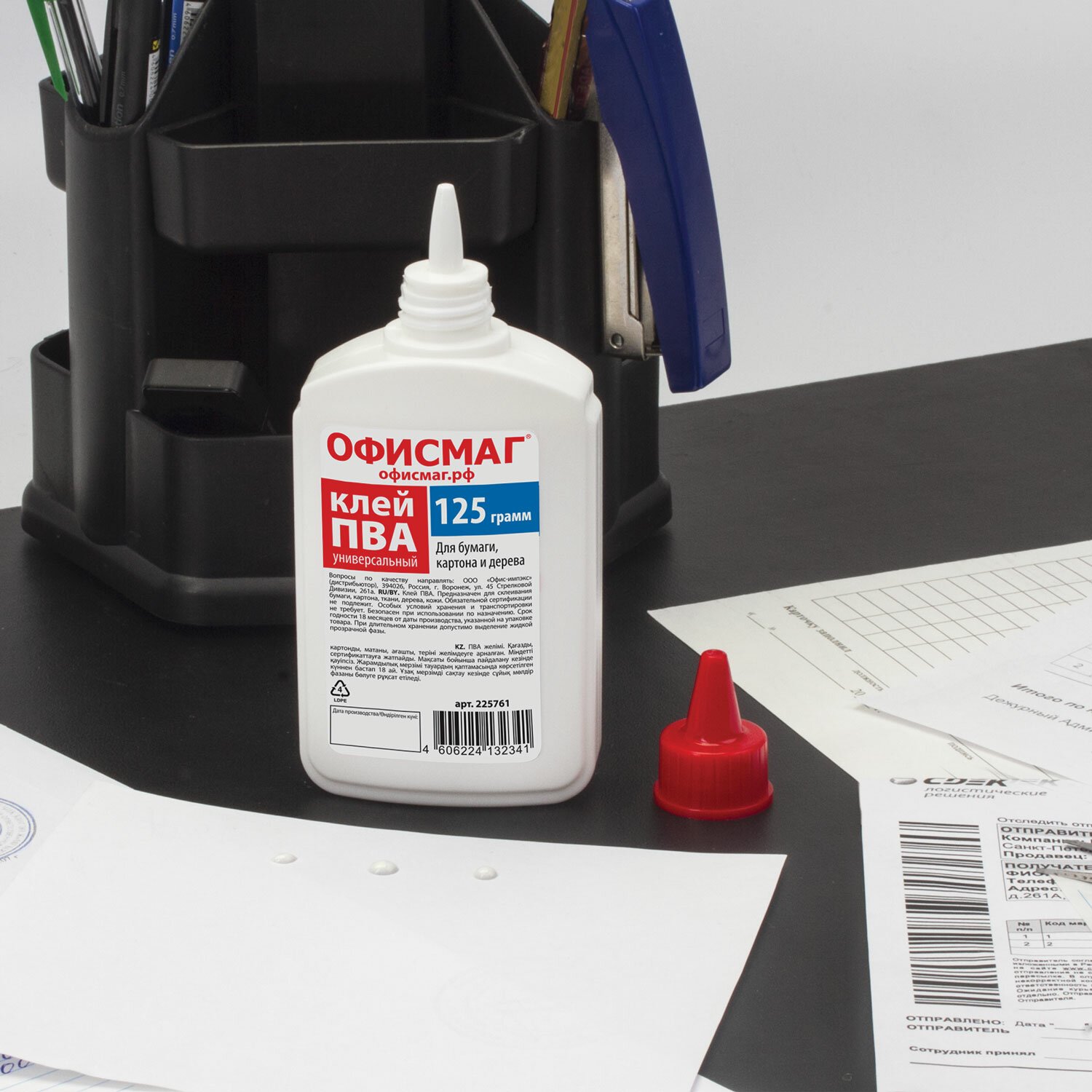 Клей ПВА ОФИСМАГ предназначен для склеивания бумаги, картона, фотографий, дерева.