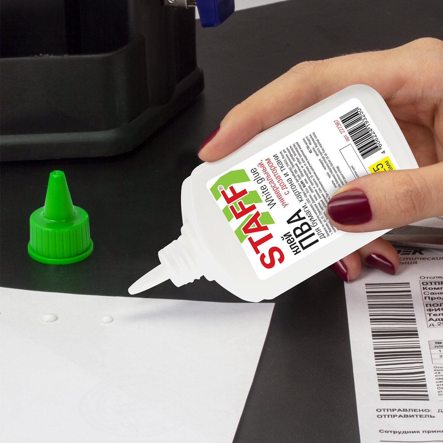 Клей ПВА STAFF EVERYDAY применяется для склеивания бумаги, картона, фотографий, дерева.