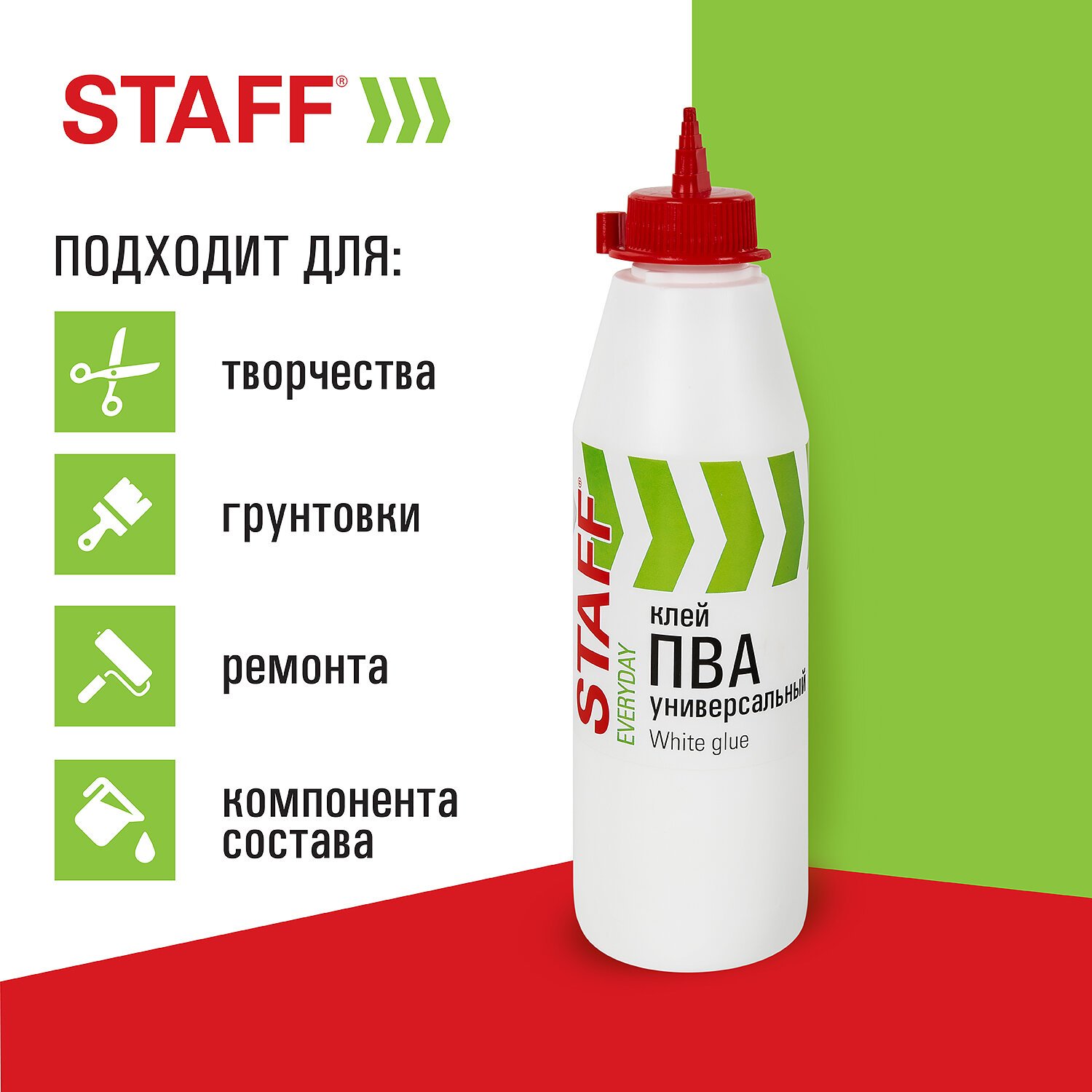 Клей ПВА универсальный STAFF применяется для изделий из бумаги, картона, тканей, виниловых и бумажных обоев. Может использоваться в качестве модификатора для улучшения технологических и адгезионных свойств.