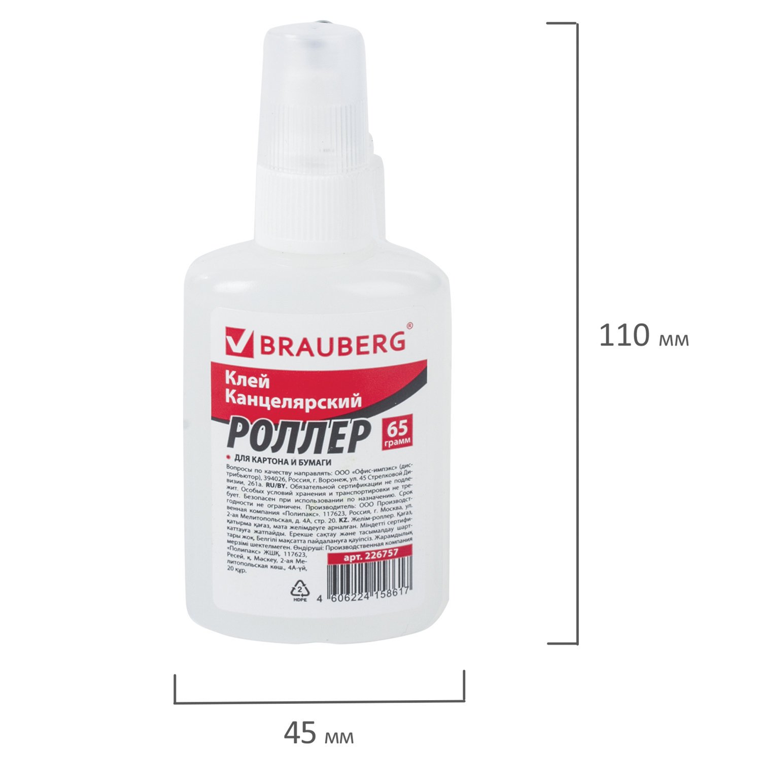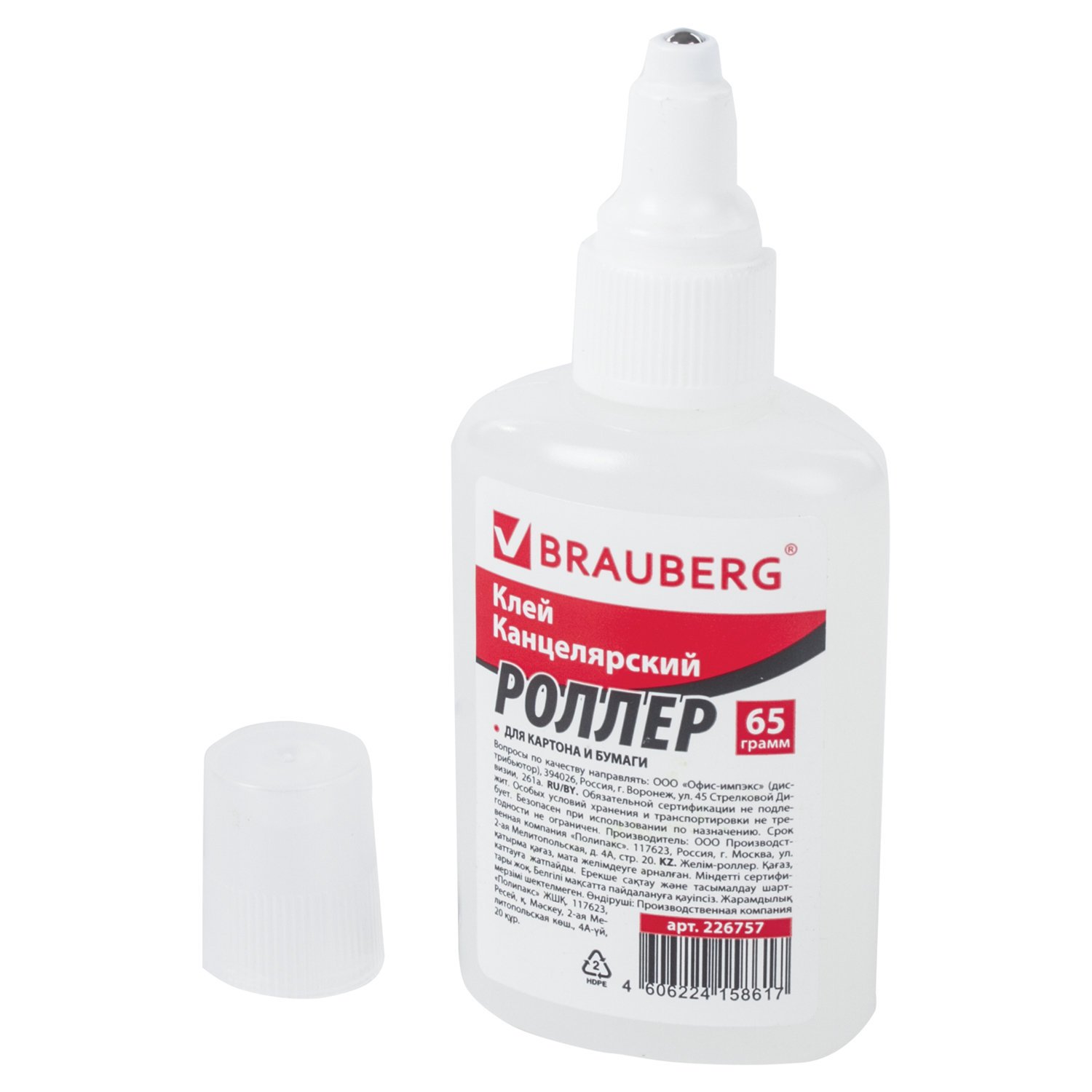 Клей-роллер канцелярский BRAUBERG (для бумаги, картона), 65 г, 226757